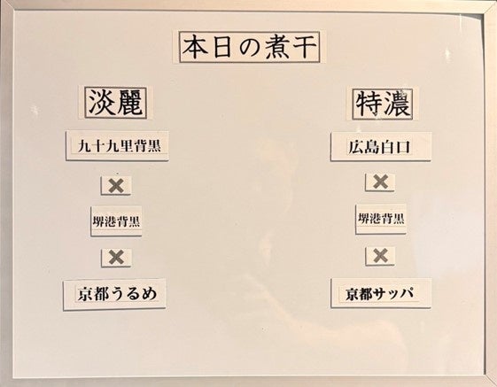 スープは、あっさりとしつつもしっかりと煮干しが感じられる「淡麗」と、濃厚でありながらも煮干しのエグみを抑えた「特濃」の2種類をご用意し、「本日の煮干」として、それぞれのスープに使用した煮干しの種類を壁に掲示しております。ご来店の際はぜひそちらをご確認いただき、その日だけ味わえる特別なスープをお楽しみください。