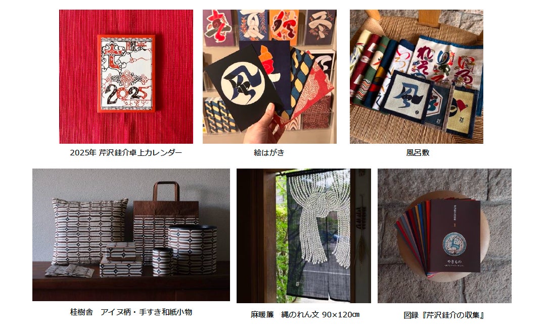 芹沢銈介模様の暖簾や風呂敷をはじめ、芹沢銈介に関連する書籍、図録・絵はがきセットなどを販売しています。