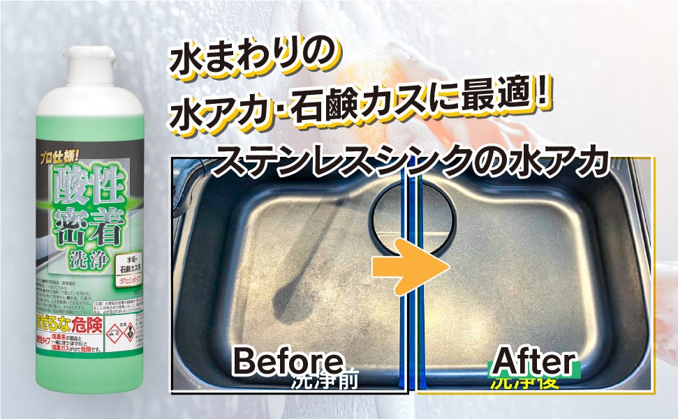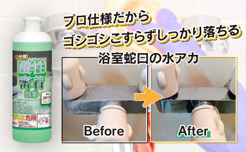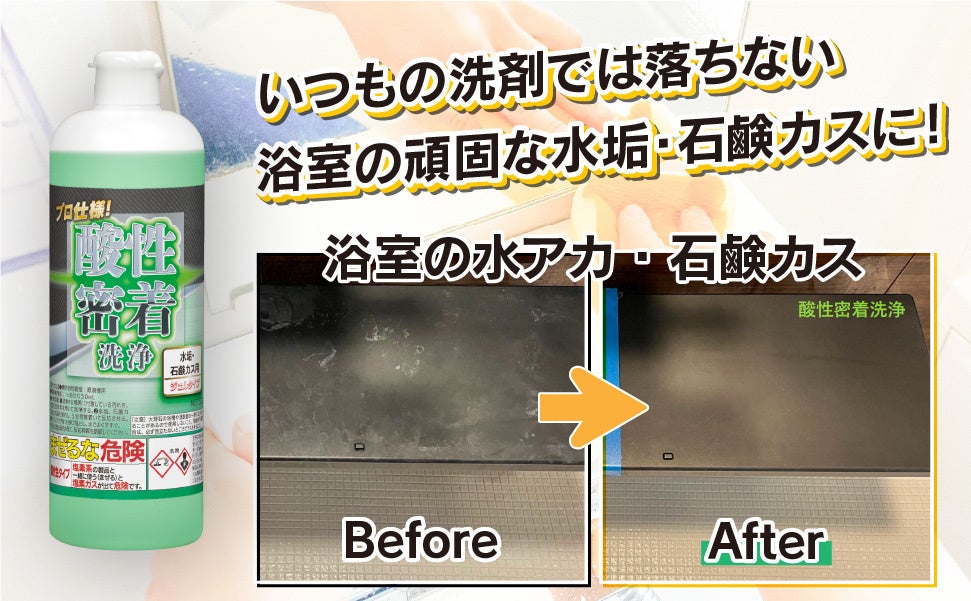 ミッケル化学株式会社(本社:東京都江東区石島2-14)は、同社初となるインターネット限定販売製品「プロ仕様!酸性密着洗浄 水垢・石鹸カス用」を発売しました。プロのハウスクリーニング現場で求められる強力な洗浄力と、一般家庭でも安心して使える「素材への優しさ」を両立。塩酸を使用しない独自の有機酸ブレンド処方により、水まわりのメンテナンスに新しいスタンダードを提案します。