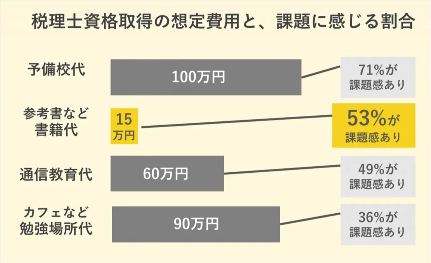 資格取得にかかる費用として、書籍代は費用が比較的かからないにも関わらず、課題感を感じる割合が53%と多い水準となっています。税理士試験は10年近くかけて長期間取り組む資格のため、「毎年買い揃えるのが大変」、「改正が多く過去の参考書が使えない」など、税理士特有の理由により負担を強く感じやすい傾向があるようです。