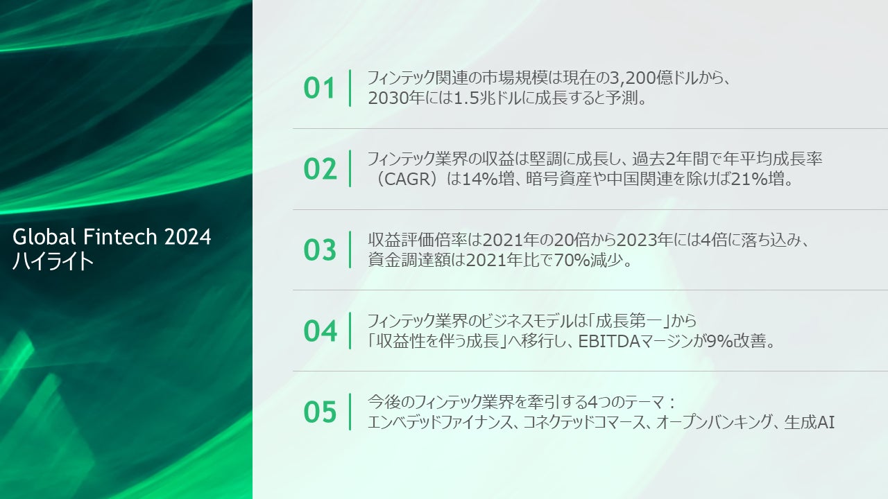 レポートでは、このような新たな環境で成功するため、リスク管理とコンプライアンスを競争優位性とみなす慎重な姿勢や、上位4分の1の企業が達成している利益率の25%ポイント向上を目指すこと、エコシステム全体の持続的な成長のための条件設定がフィンテック領域に取り組む企業にとって重要であると解説しています。
