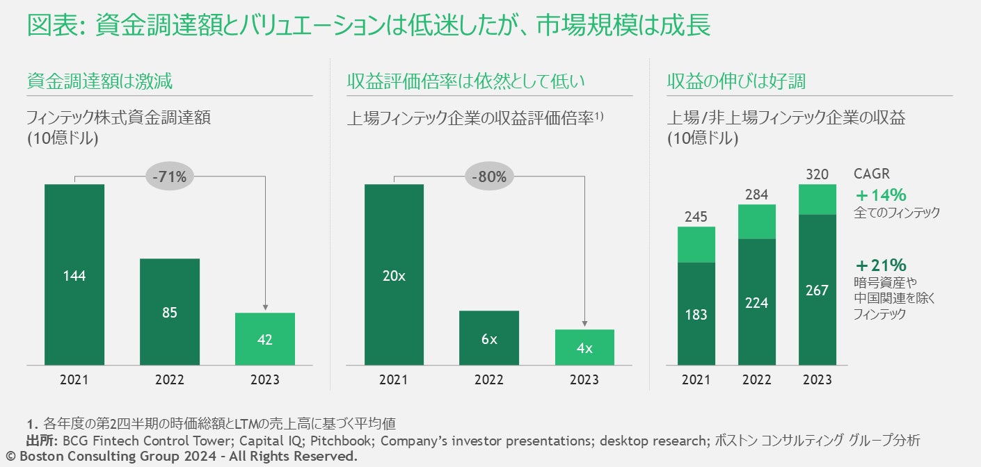 また、世界のフィンテック企業は堅調に収益を伸ばし続けており、過去2年間、年平均成長率(CAGR)は14%増加、暗号資産や中国関連のフィンテックを除くと同21%の成長を遂げています。一方、レベニュー・マルチプル(収益評価倍率)[注1]は高水準だった2021年の平均20倍から2023年には4倍に落ち込みました。加えて、資金調達額は2021年比で70%減少し、特に過去1年間で50%近く減少しました(図表)。