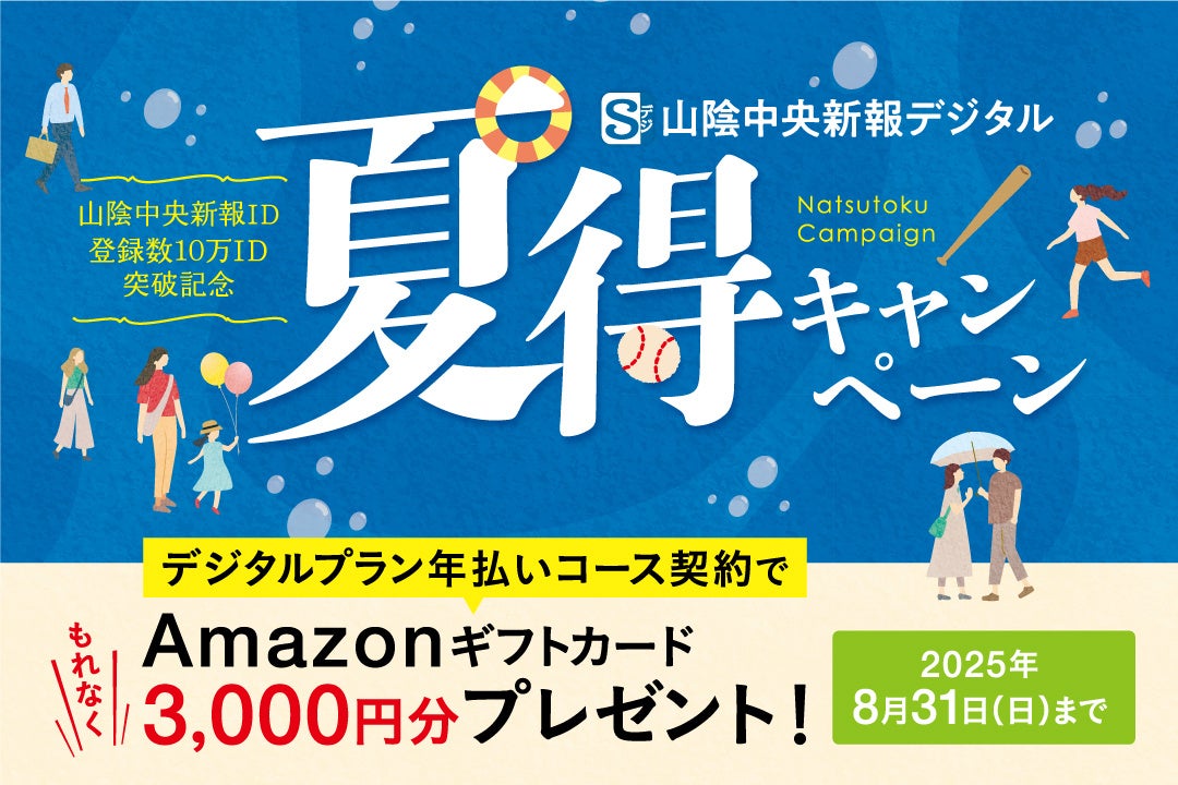 株式会社山陰中央新報社のニュース配信サービス「山陰中央新報デジタル(Sデジ)」 は2025年8月31日(日)まで「山陰中央新報ID登録数10万ID突破記念 夏得キャンペーン」を実施中です。デジタルプランの新規ご契約(年払い)で、3,000円分のAmazonギフトカードをプレゼントします。