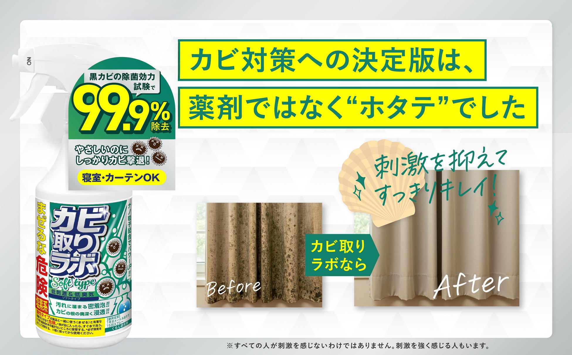 マイルドな成分設計ではありますが、製品に配合したナノ粒子化したホタテ貝殻パウダー(水酸化カルシウム)が、カビの奥深くまで優れた除菌作用を発揮。水洗いができない場合でも水拭きと乾燥だけで、簡単に使用いただける製品に仕上げました。