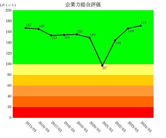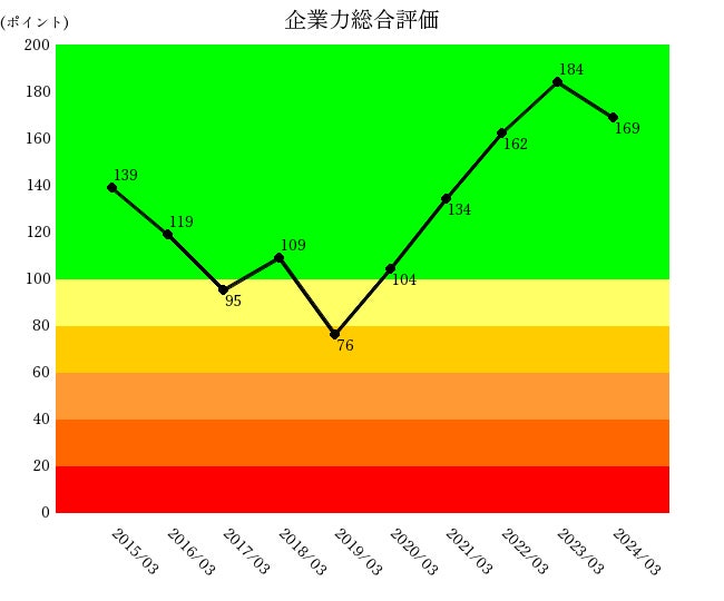 統計学に基づく独自スコア「企業力総合評価」を搭載。“成長=倒産から遠ざかること”と定義し、一本のグラフで推移を可視化します。