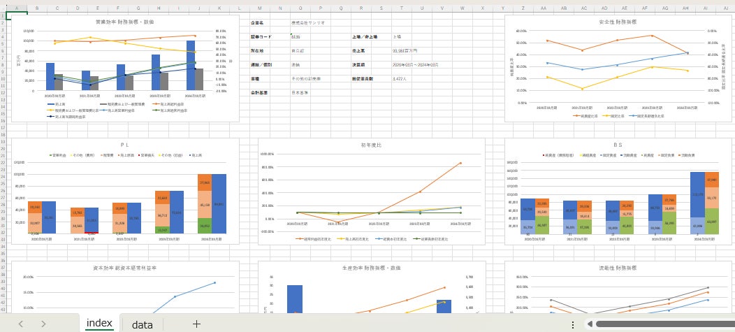 マンダラ表では、個社分析について5期分の主要な指標をA3サイズの1枚にまとめています。