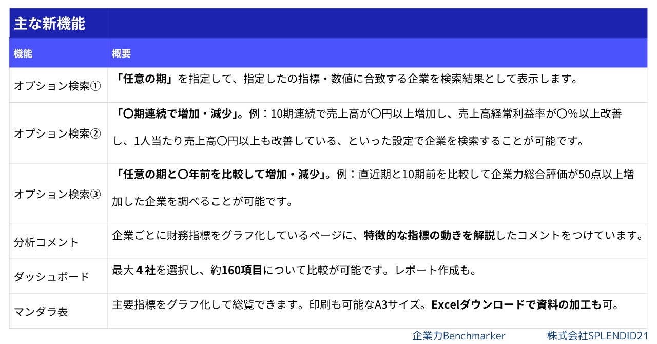 株式会社SPLENDID21(本社:大阪市中央区、代表取締役:山本純子、以下SPLENDID21)は、財務分析サイト『企業力Benchmarker(https://bm.sp-21.com/)』の最新版を公開しました。今回のアップデートでは、オプション検索、解説コメント、企業比較ダッシュボード、マンダラ表を新たに実装し、財務分析のスピードと精度を飛躍的に高めます。