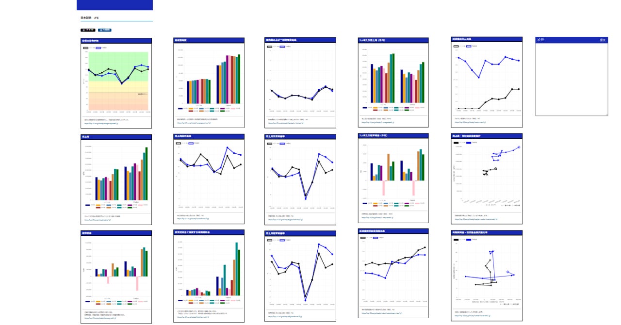 ダッシュボードでは、好きな企業を最大4社選択し、財務指標も約160項目のなかから好きなだけ選択してグラフ化が可能です。附属するメモを書くことで、各グラフを見ながら気づいたことをレポートできるので、漫然とグラフを見て終わってしまうのではなく、意見形成もスムーズに行えます。