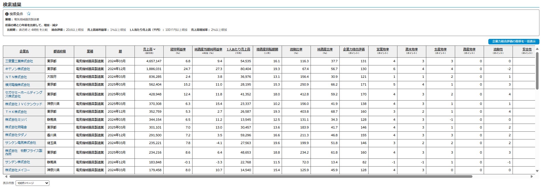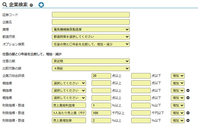 上記の画像の場合は、以下のすべての条件に当てはまる企業を検索します。