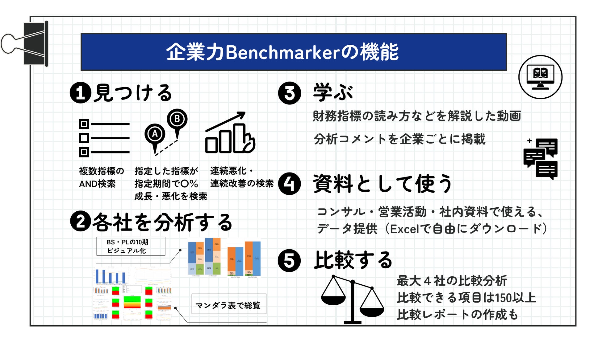 企業の課題解決の糸口を、先人(他社)から見つける出すことができるのが、企業力Benchmarkerの面白いところです。