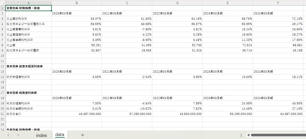 分析コメントは、各タブ(カテゴリ)ごとに記載されています。各企業の指標の動きに合わせた読み方が解説されていることで、自然と数字を読み解く力が養われます。