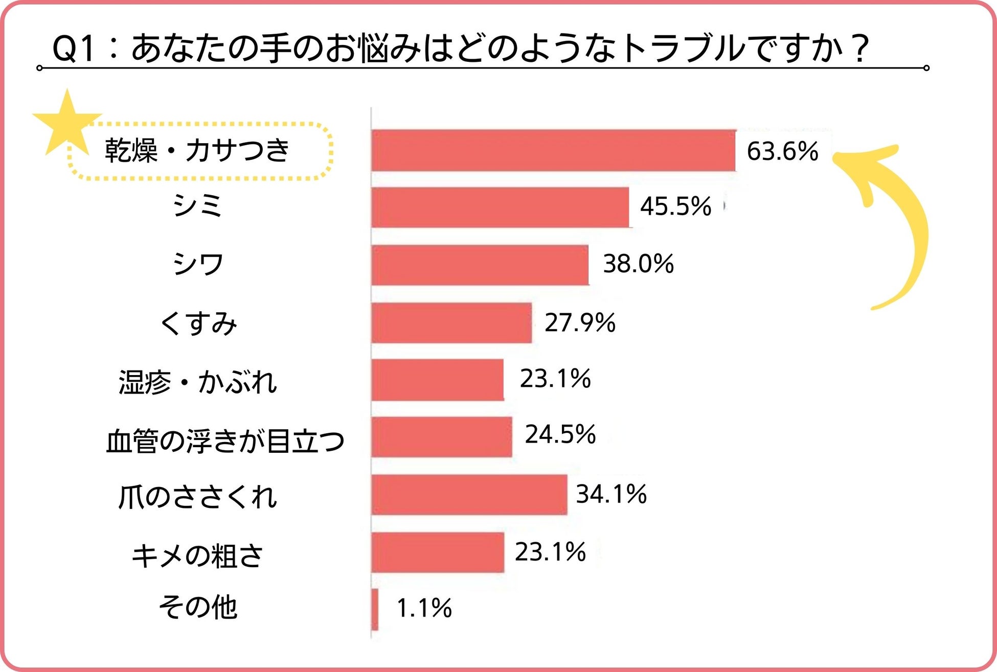 「あなたの手のお悩みはどんなトラブルですか?」という問いに対して、「乾燥・カサつき」と回答した人は半数以上の約63%で第1位でした。次に多いお悩みは「シミ」で約45%、「シワ」約38%となっています。