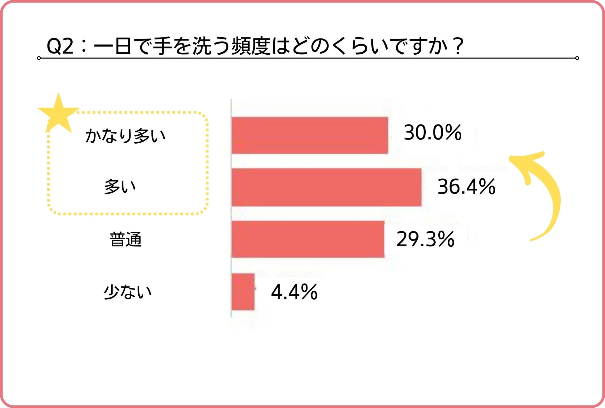 「一日で手を洗う頻度はどのくらいですか?」という問いに対して、「多い」と回答した方は約36%で、「かなり多い」と回答した方の約30%とあわせると約66%となり、半数以上の方が一日に手を洗う頻度が多いと認識していることが分かりました。