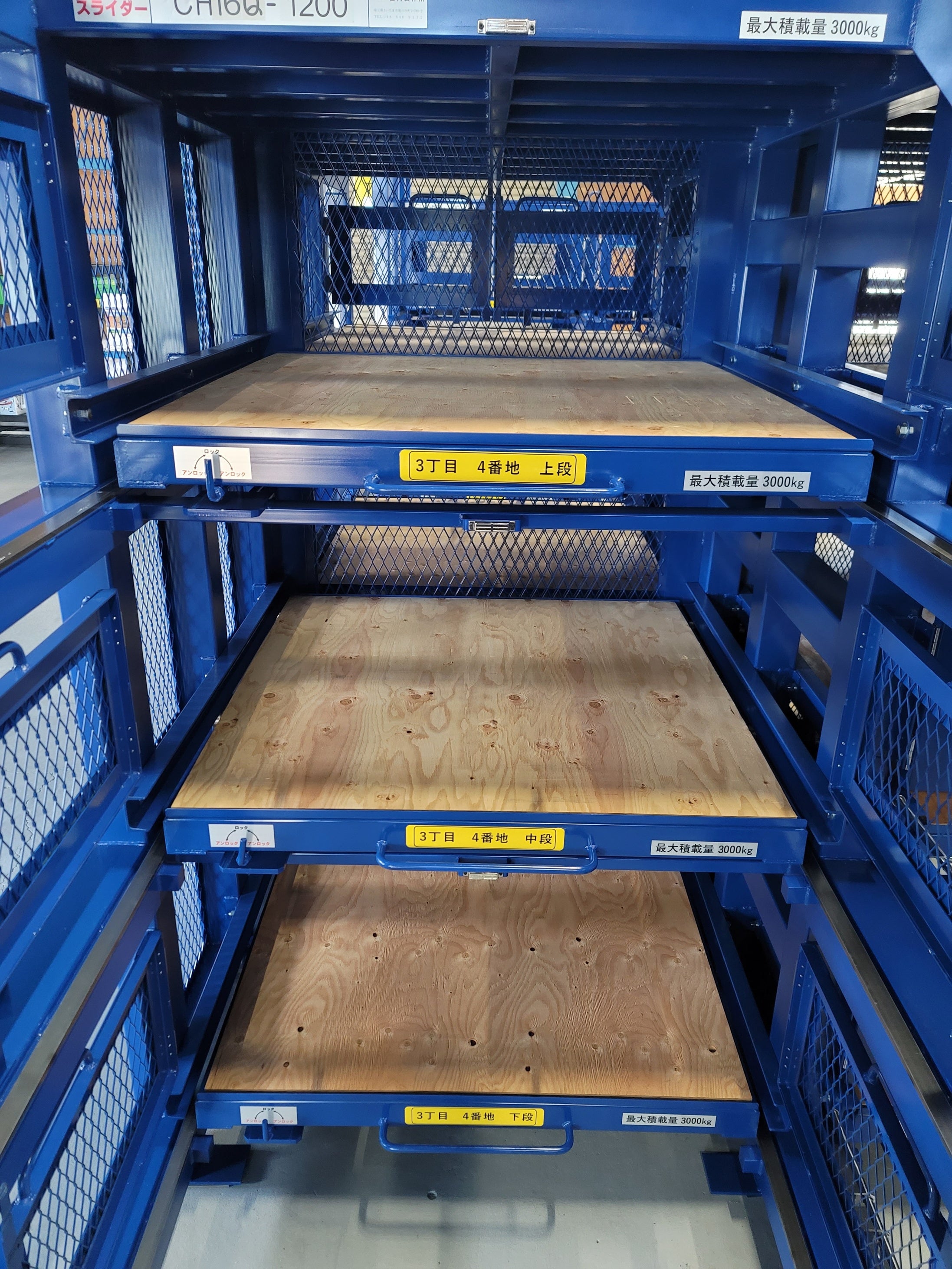 現場の状況や金型のサイズに合わせ、2段〜4段、耐荷重2t〜3tといった仕様のほか、長さや奥行きなどの寸法もオーダーメイドで製作することが可能である。