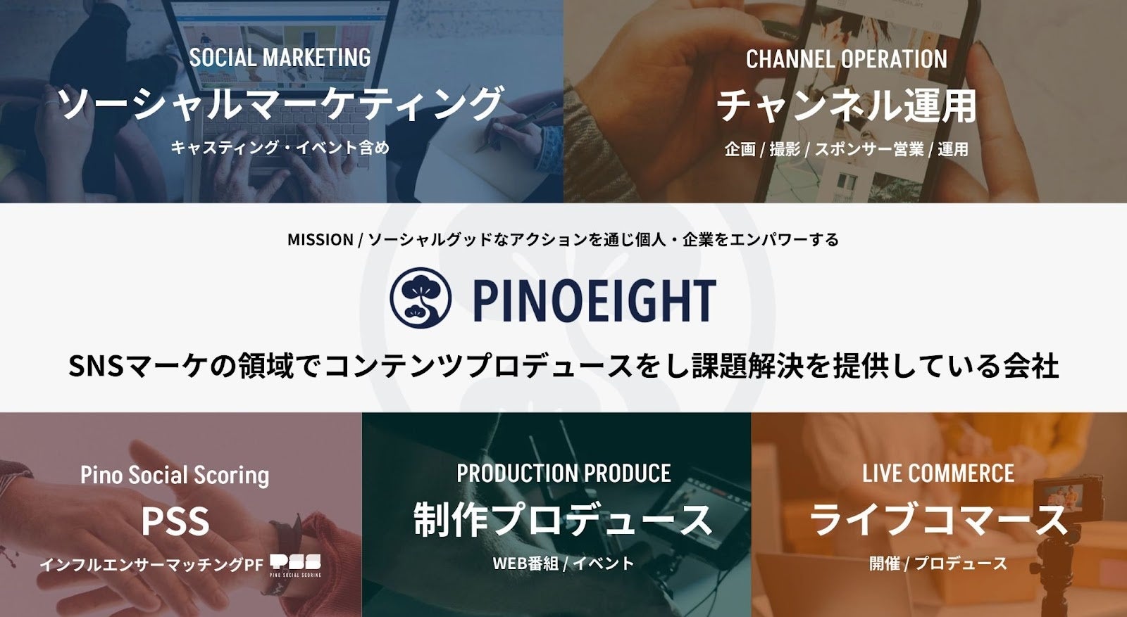 Pinoeight(ピノエイト)は、SNSマーケの領域でコンテンツプロデュースをし課題解決を提供している会社です。