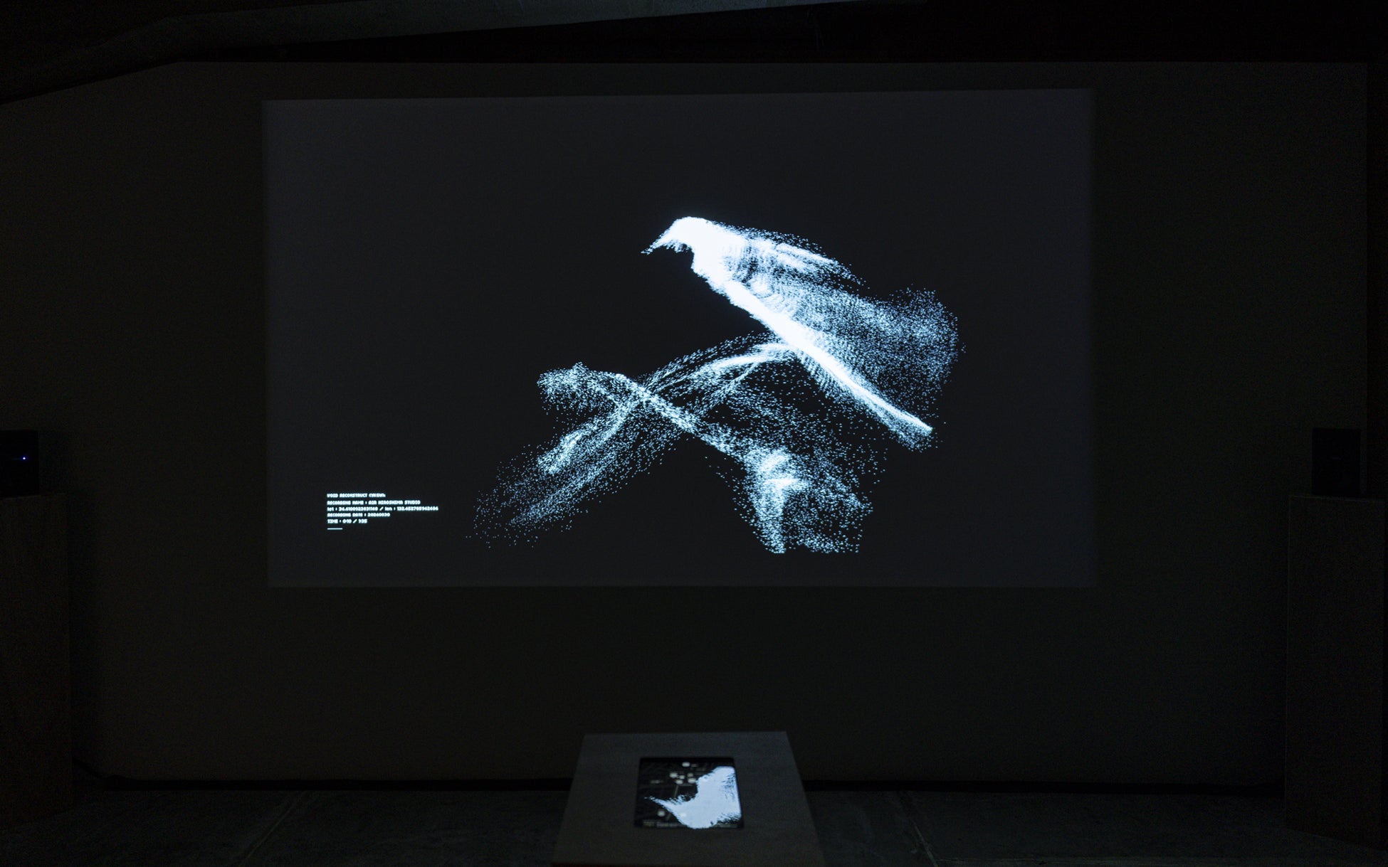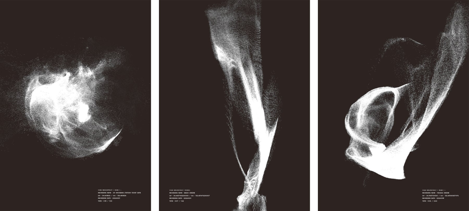 本作は、2024年に広島県横川エリアでの地方創生プロジェクトの一環として「ARTIST IN RESIDENCE プログラム」に参加し、現地で滞在制作を行ったものです。会場では、このプロジェクトから生まれたヴィジュアライゼーションによる作品を中心に、広島に本社を構える株式会社歴清社とのコラボレーションによる、その図像をアーカイブし金銀箔紙を活用した、デジタル技術と伝統工芸の融合による平面作品展示も行います。