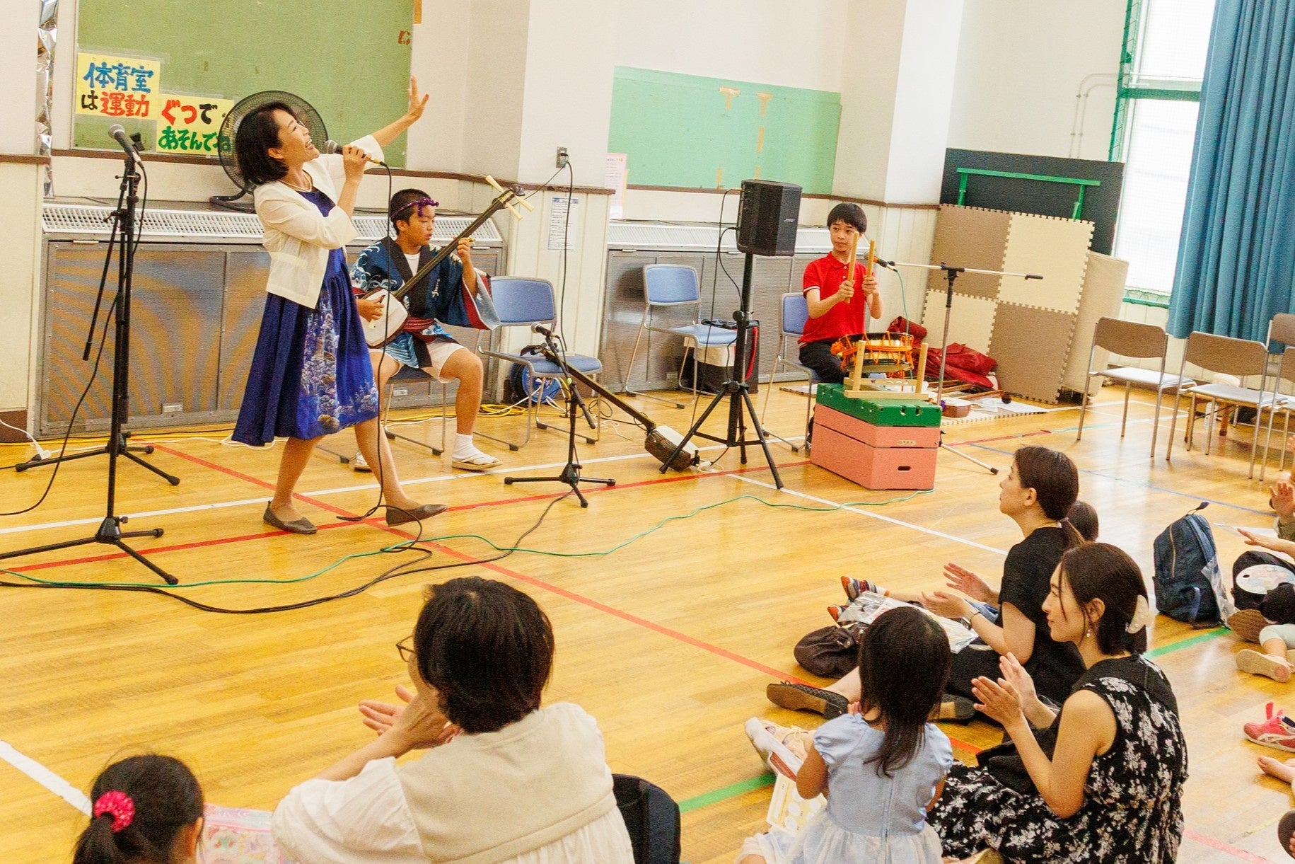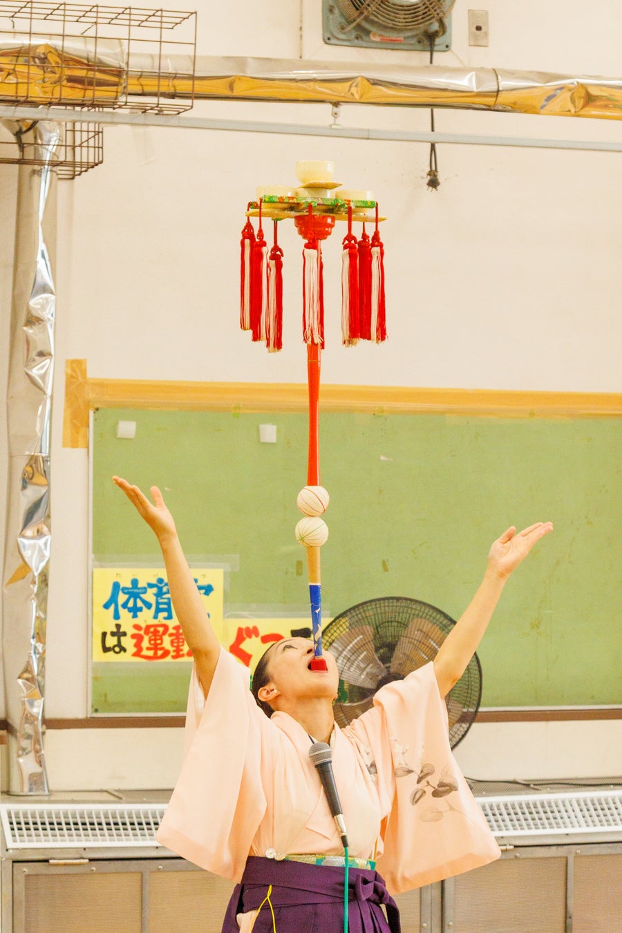 民謡では、日本各地に伝わる唄がメドレーで披露され、津軽三味線の力強い音色に子どもたちは目を輝かせて聴き入っていました。太神楽のステージでは、傘の上で玉を回す技や、「五階茶碗」などの妙技に驚きの声があがり、会場は拍手と笑顔に包まれました。