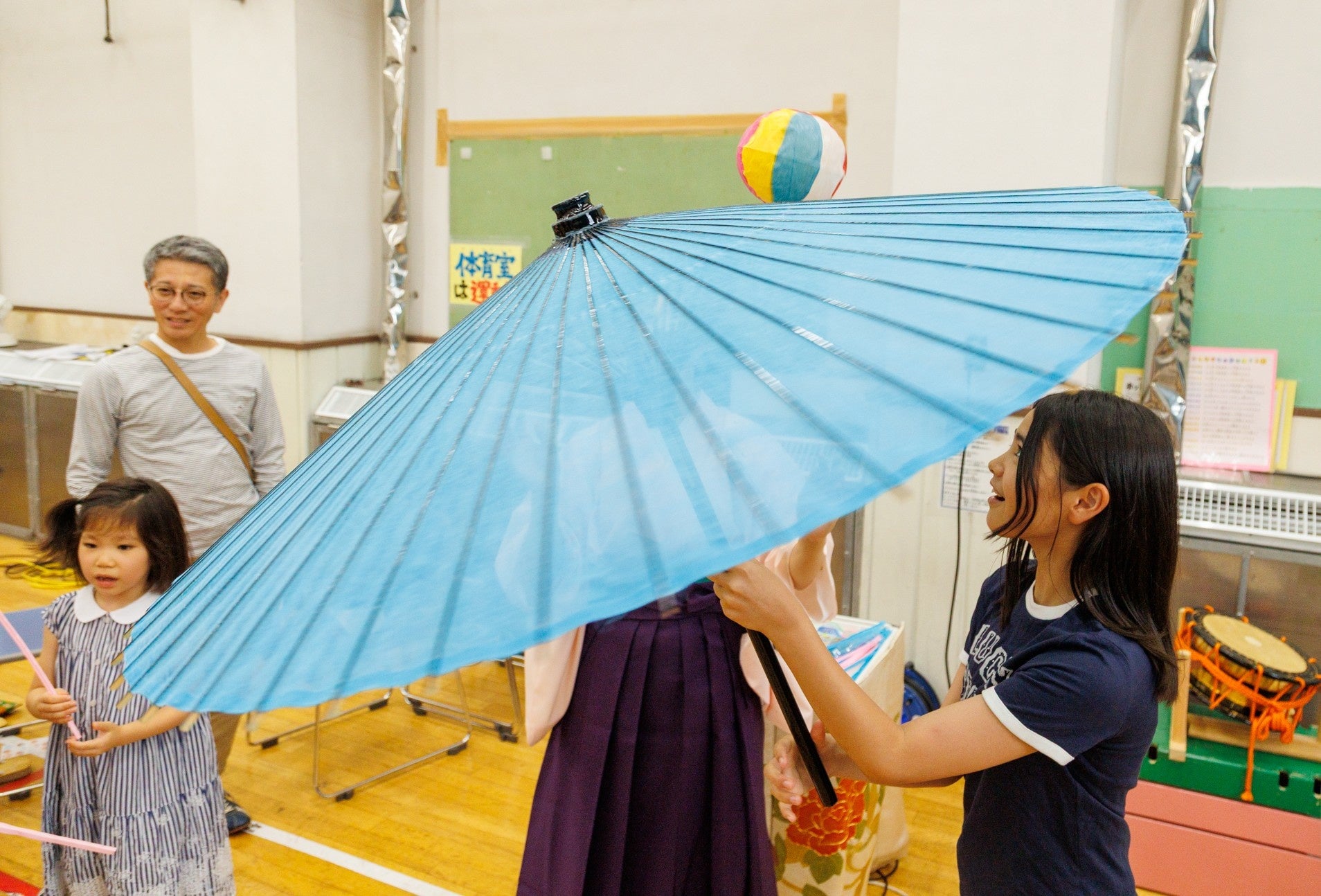 民謡体験では講師と一緒に歌い、「もう一回歌いたい!」と繰り返し挑戦する子どもたちの姿も。三味線や琵琶、箏の体験では、初めての和楽器に戸惑いながらも真剣に音を鳴らそうとする様子が印象的でした。着物体験では、子どもたちが和装に身を包み、親子で写真を撮りながら日本の衣装文化を楽しく体験していました。太神楽の体験では、実際に傘を使って曲芸に挑戦し、笑顔と歓声が絶えないにぎやかなブースとなりました。