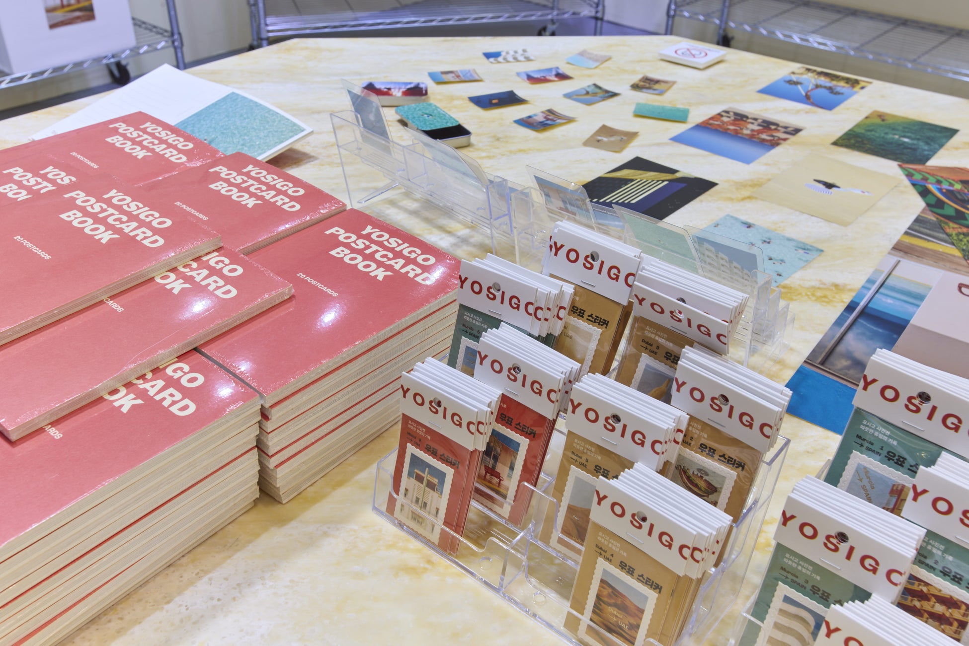 展示の最後のスペースには特設ショップも設置され、韓国の展示会で発売されたグッズのほか、日本オリジナルグッズとして、ポストカード(全20種)、ステッカー(全10種)、A3ポスター(全10種)、A2ポスター(全4種)、タブレットケース(全2種)、クリアフォトカード(全10種)を販売。いずれもYOSIGO展を象徴する色鮮やかなグッズで、10月19日からはがま口ポーチ(全2種)の発売も決定されています。さらに本展の開催を記念し、MOUSSYがデザインを手がけたオリジナルグッズも発売。Tシャツやプルオーバー、タオルなど、普段使いできるラインナップは、会場とMOUSSY一部店舗およびSHEL'TTER WEBSTOREにて販売されます。