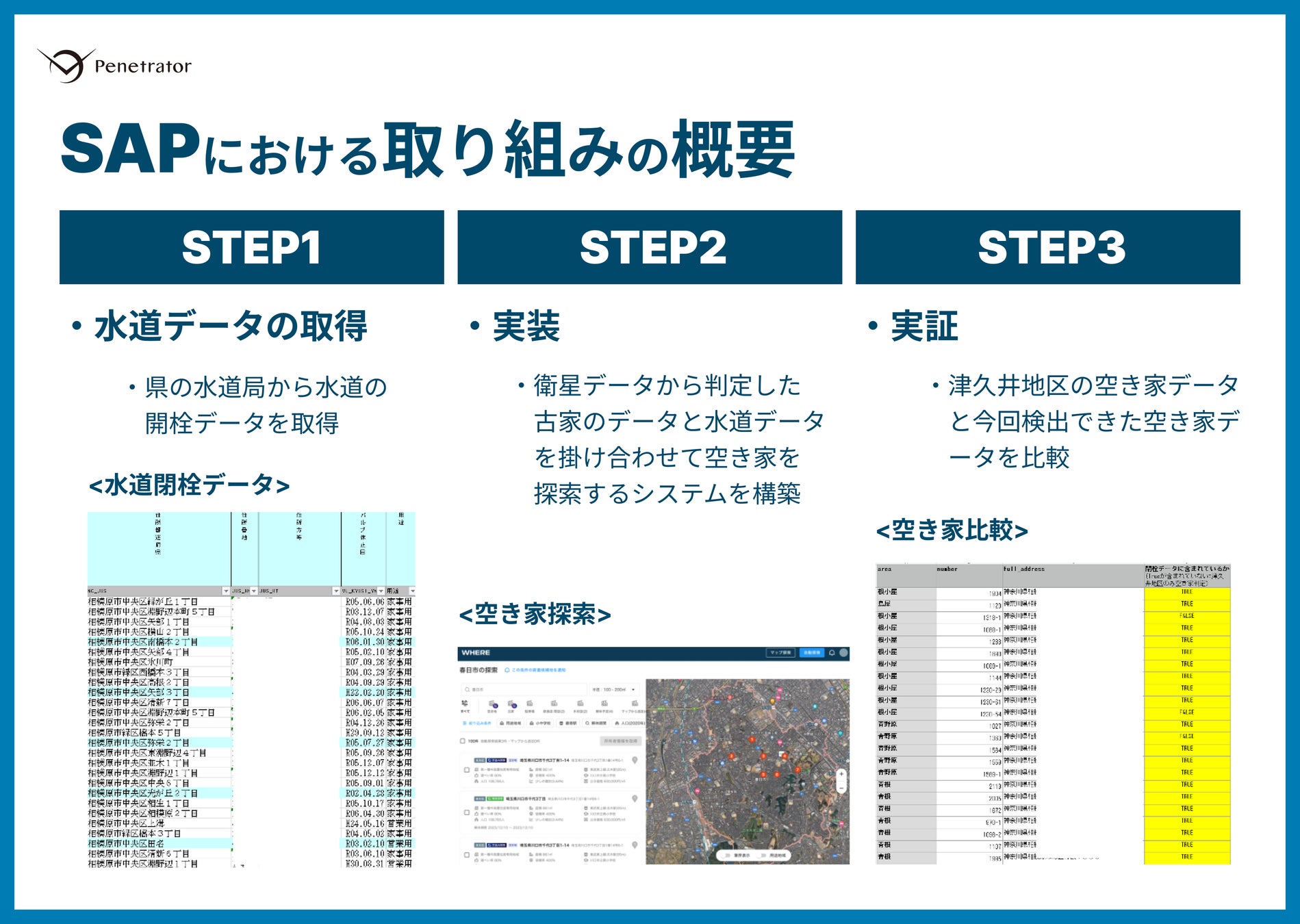 株式会社Penetrator(本社:東京都文京区、代表取締役:阿久津岳生、以下「Penetrator」)は、衛星データとAIを活用して不動産仕入れプロセスをDXするSaaS『WHERE』を提供するJAXA発スタートアップです。このたび、当社は衛星データと水道の開栓・閉栓データを組み合わせ、空き家候補を効率的に特定する新たなシステムを開発しましたので、お知らせいたします。