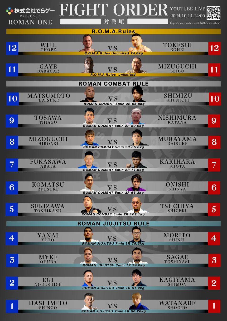 ROMAN株式会社(本社:神奈川県鎌倉市、代表取締役CEO:渡辺直由)は、2024年10月14日(月・祝)開催の旗揚げ大会「でらゲーPRESENTS ROMAN ONE(ローマンワン)」の全対戦カードを発表いたしました。令和の時代に復活する「バーリトゥード(何でもあり)」と新ルール「道着着用MMA」、禁止技を解禁した「新柔術ルール」を採用した今回の大会は、格闘技ファン必見のかつてない試合が繰り広げられる予定です。更に今回はYouTubeでの全試合無料ライブ配信が決定!日英両言語の実況・解説が付き、世界中のファンがリアルタイムで試合を楽しむことができます。
