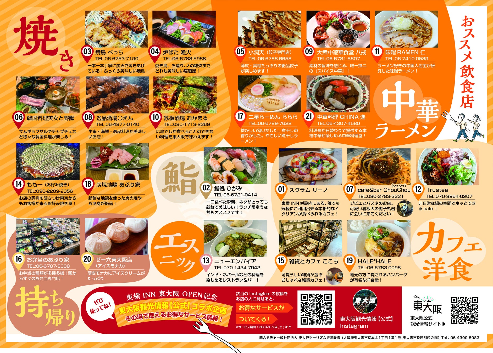 この度、東大阪ツーリズム振興機構と東横INNは、「東横INN東大阪」オープンを記念し、ホテル周辺の飲食店並びに地域の活性化を目的とした、東大阪のグルメをお得に楽しめるSNSキャンペーンを開催します。計17店舗が参加し、ドリンクサービスから、メニューの割引まで、店舗毎にお得なサービスを提供します。東大阪市民はもちろん、東大阪を訪れる国内外の旅行客の皆様は、本キャンペーンをご利用いただき、東大阪グルメをお得にお楽しみください。