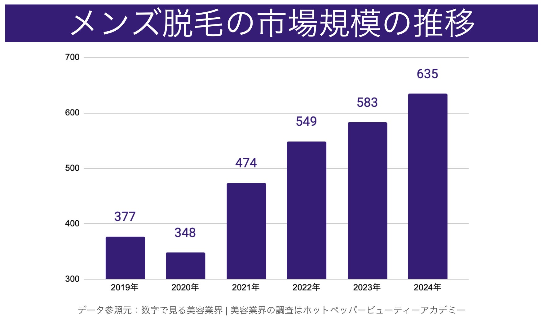リクルートが運営する調査研究機関「ホットペッパービューティーアカデミー」の数字で見る美容業界内のメンズ脱毛の市場規模に関するデータを見ると、2024年の市場規模は約635億円と、コロナ禍で一時的に市場規模は縮小していますが、その後、伸び続けていることが分かります。
