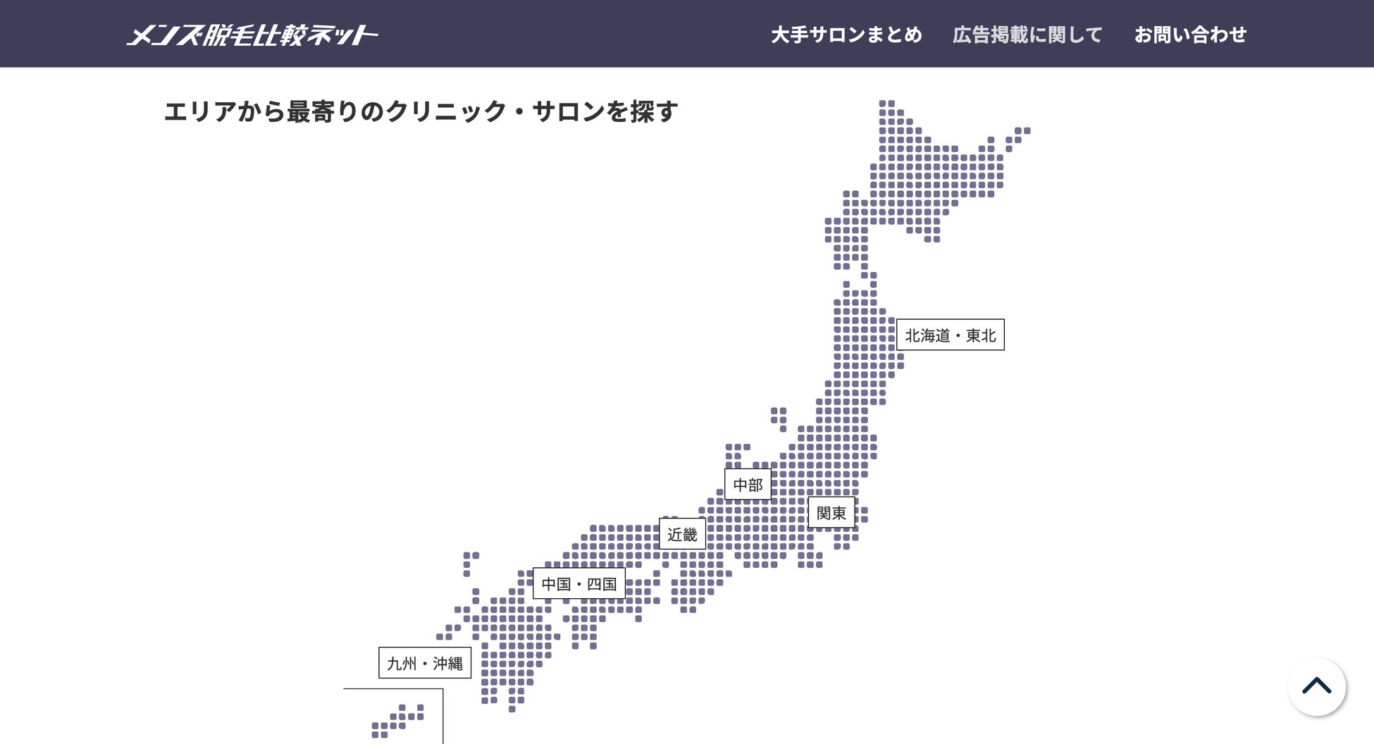 現在全国70以上の男性に特化した脱毛サロンやクリニックを掲載しており、北海道から九州までエリア別に店舗を絞り込める機能も搭載しています。