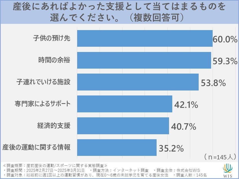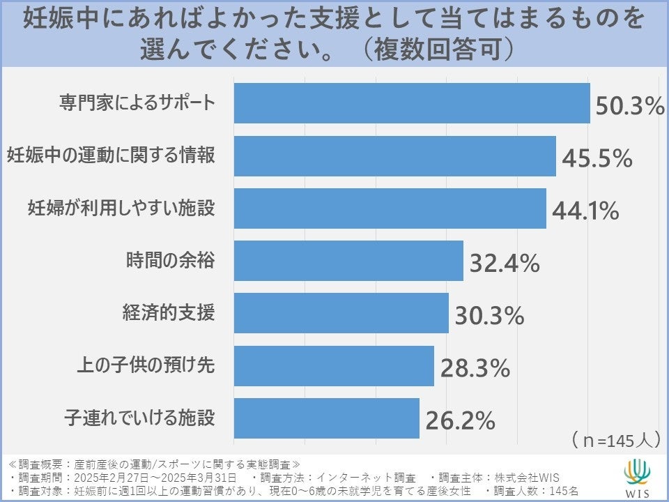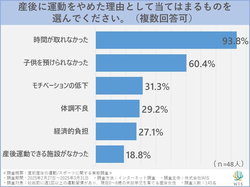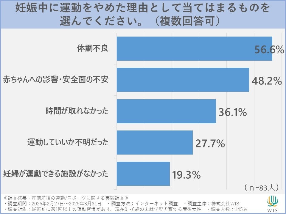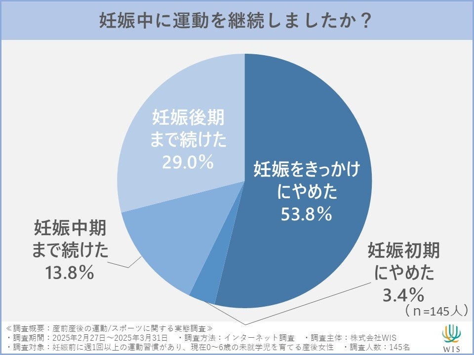 女性とスポーツの未来を創る株式会社WIS(本社:東京都渋谷区 代表取締役社長:平井晴子、以下WIS)は、2025年2月27日~3月31日、妊娠前に週1回以上の運動/スポーツ(以下、運動)を習慣的に行っていた、現在未就学児を育てる産後女性145人を対象に、運動に関するインターネット調査を実施しました。