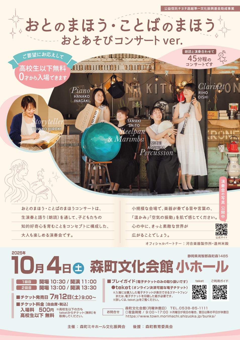 愛知県 田原市・静岡県 森町で、乳幼児から大人まで子育てファミリーが楽しめる演奏会「おとのまほう・ことばのまほうコンサート」を開催します。0歳児から入場可。<高校生以下無料/大人500円(税込)>