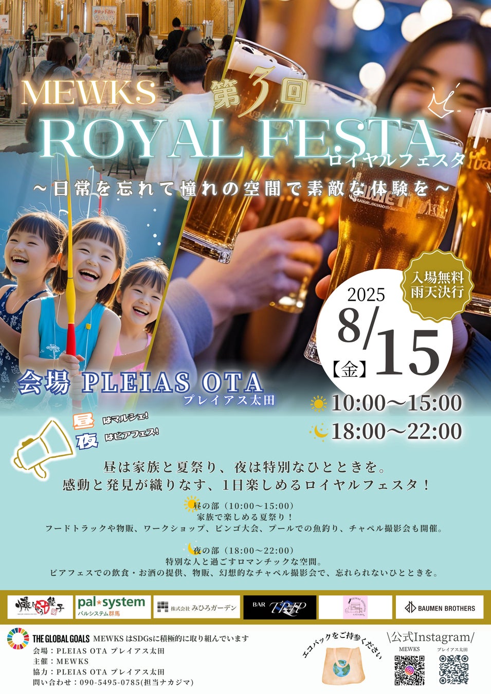 結婚式場「PLEIAS OTA」にて、2025年8月15日(金)に「第3回MEWKSロイヤルフェスタ」を開催いたします。入場無料、雨天決行。