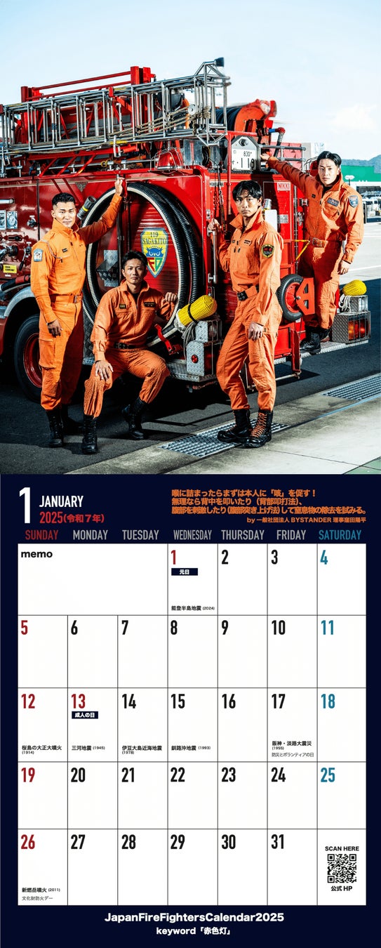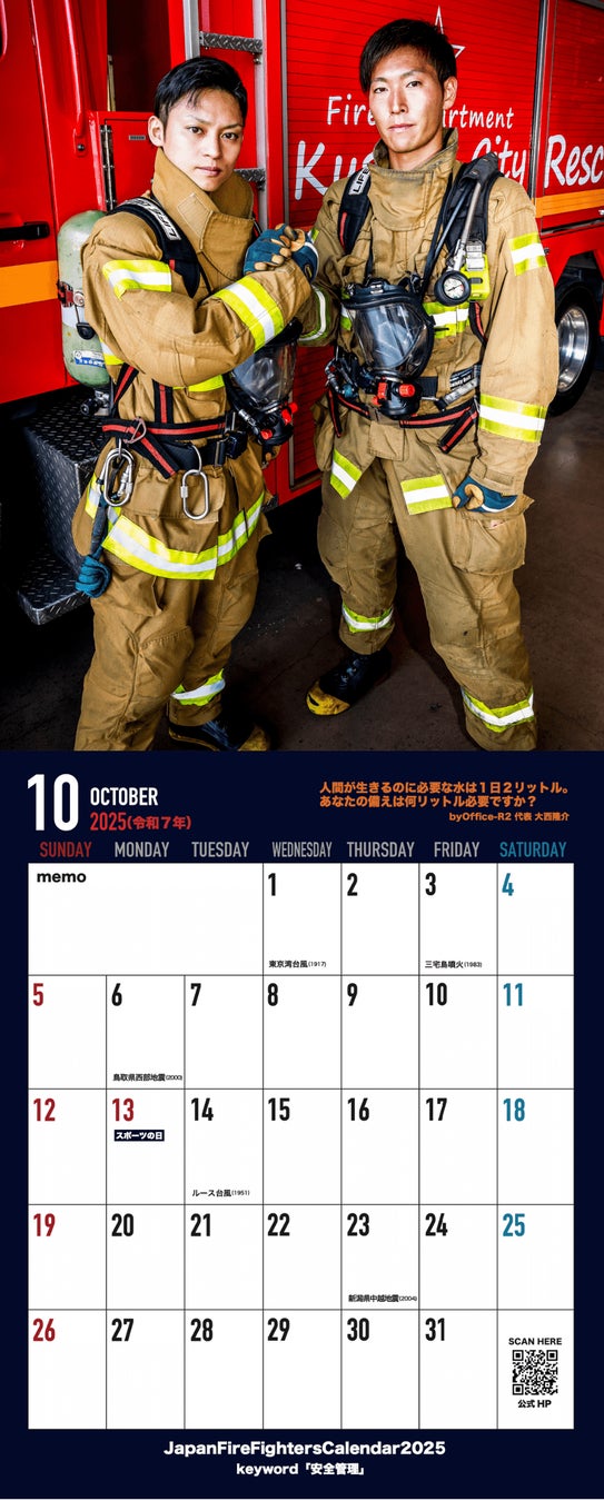 全国の消防士を掲載した「JapanFireFightersCalendar2025」を10月1日に正式リリースします。 こちらは、防火服、救助服、救急服、活動服、制服に身を包んだ消防士達のかっこいい姿(商品 名:消防士カレンダー)や鍛え上げられた肉体を披露したを姿(商品名:消防士の休日カレンダ ー)を掲載したカレンダーで、北は北海道、南は沖縄まで、全国の消防士等が掲載されています。