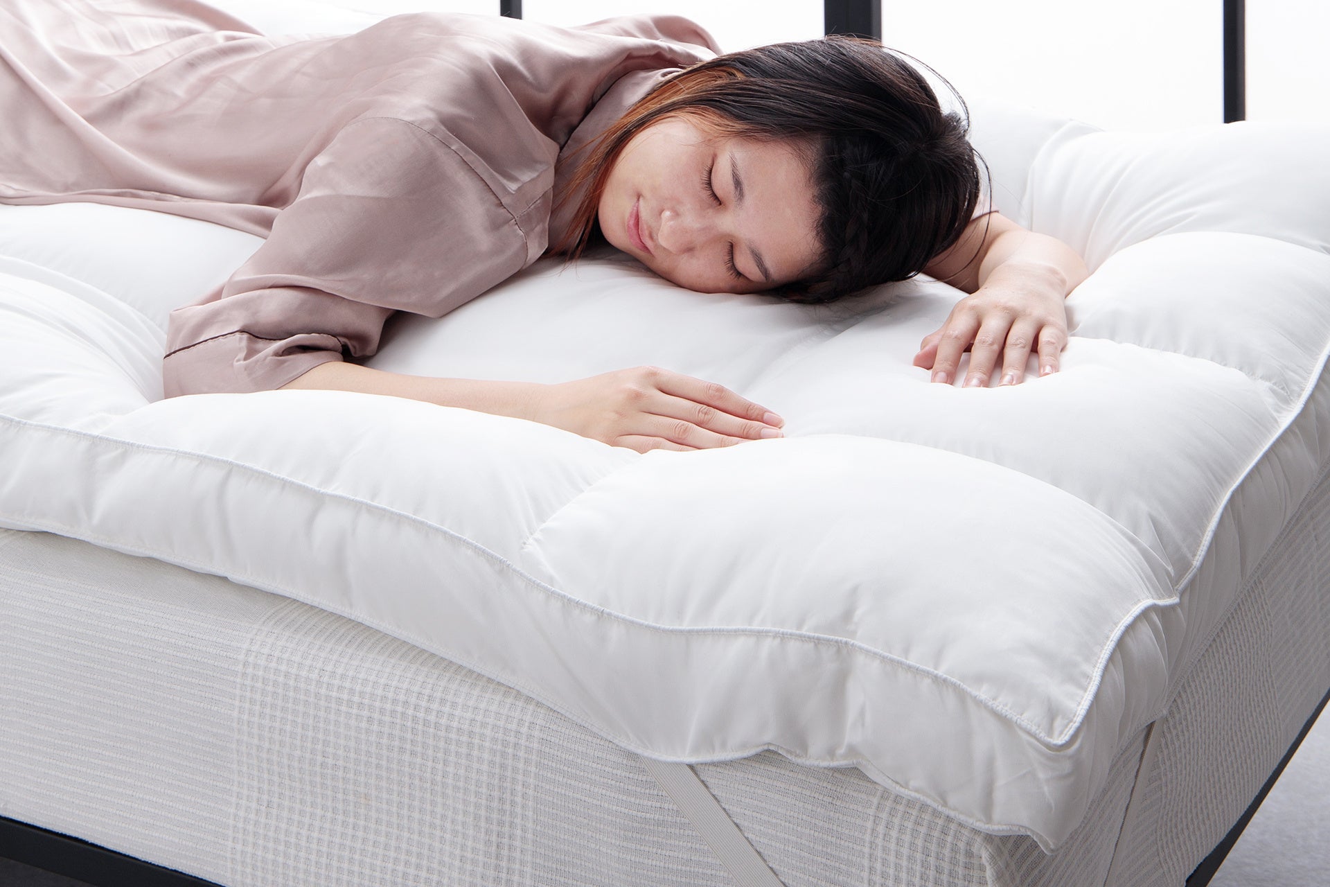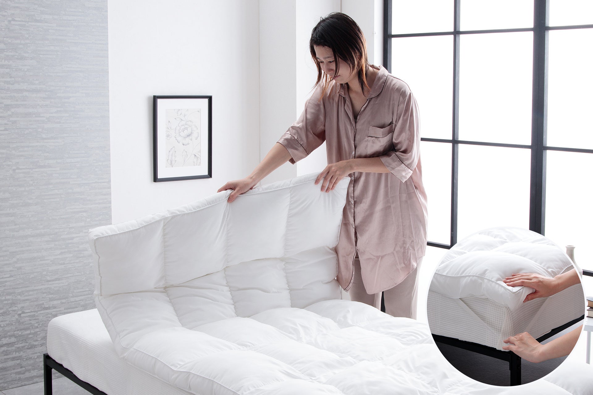 お使いのマットレスや敷き布団に極厚7cmのマシュクルをさっと敷くだけで、ふわっとしたボリューム感と上質な寝心地が広がります。