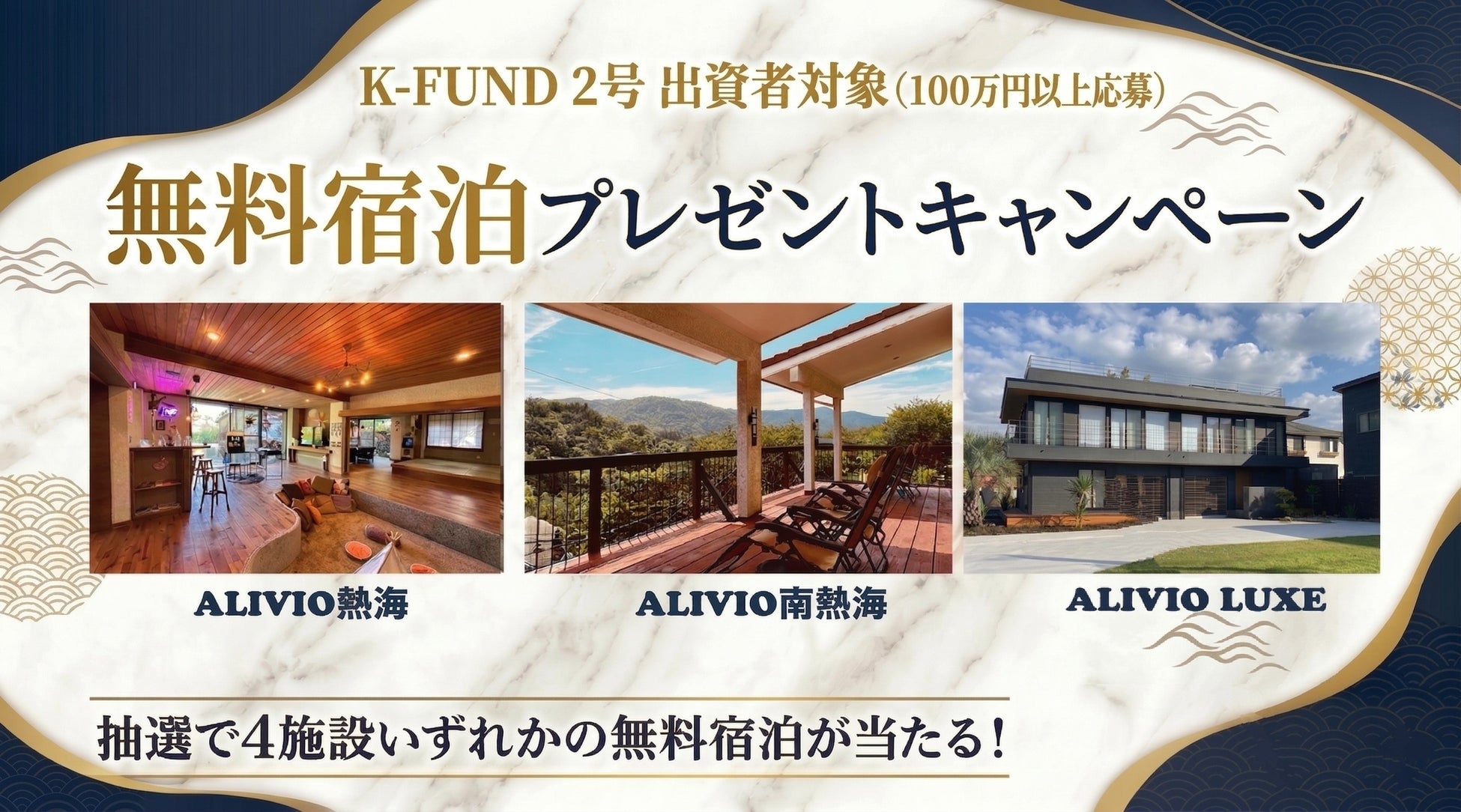 2号ファンドの募集を記念して、100万円以上を応募・出資(抽選の結果、出資金額が100万円を下回った場合も含む)された方を対象に、抽選で10名様に弊社グループが所有する「ALIVIO熱海」・「ALIVIO南熱海」・「ALIVIO伊豆」・「ALIVIO LUXE」いずれかの無料宿泊プレゼントキャンペーンを実施いたします。※宿泊プレゼント対象日:GW、お盆、お正月を除く