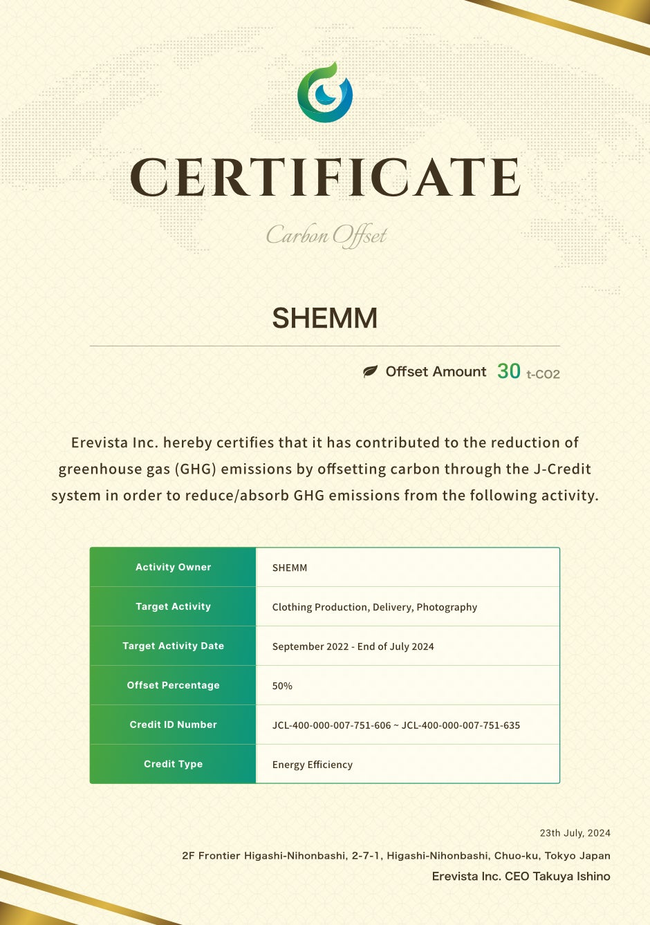 環境問題への関心が高まり、多くの企業が持続可能なビジネスモデルを追求しているが、アパレルブランドである「 SHEMM ( シェム ) 」は、服作りや撮影、商品配送などで排出されたCO2を削減するためにJクレジットを活用することに決め、アパレルブランド設立から1年と少しが経ち自社のグローバルECプラットフォーム(https://shemmparis.com)を軸に環境への配慮と持続可能なビジネスモデルを実現するための取り組みを続けている。今回、会社設立から今夏までに出したCO2の約50%分のJクレジットの購入を行った。SHEMMがオフセットを行った真意に迫っていこうと思う。