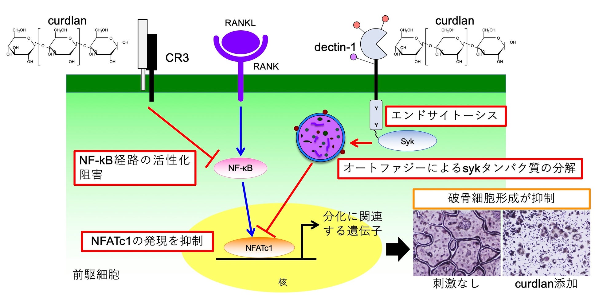 curdlanは、dectin-1と結合し、破骨細胞分化誘導に必要なタンパク質を分解する。