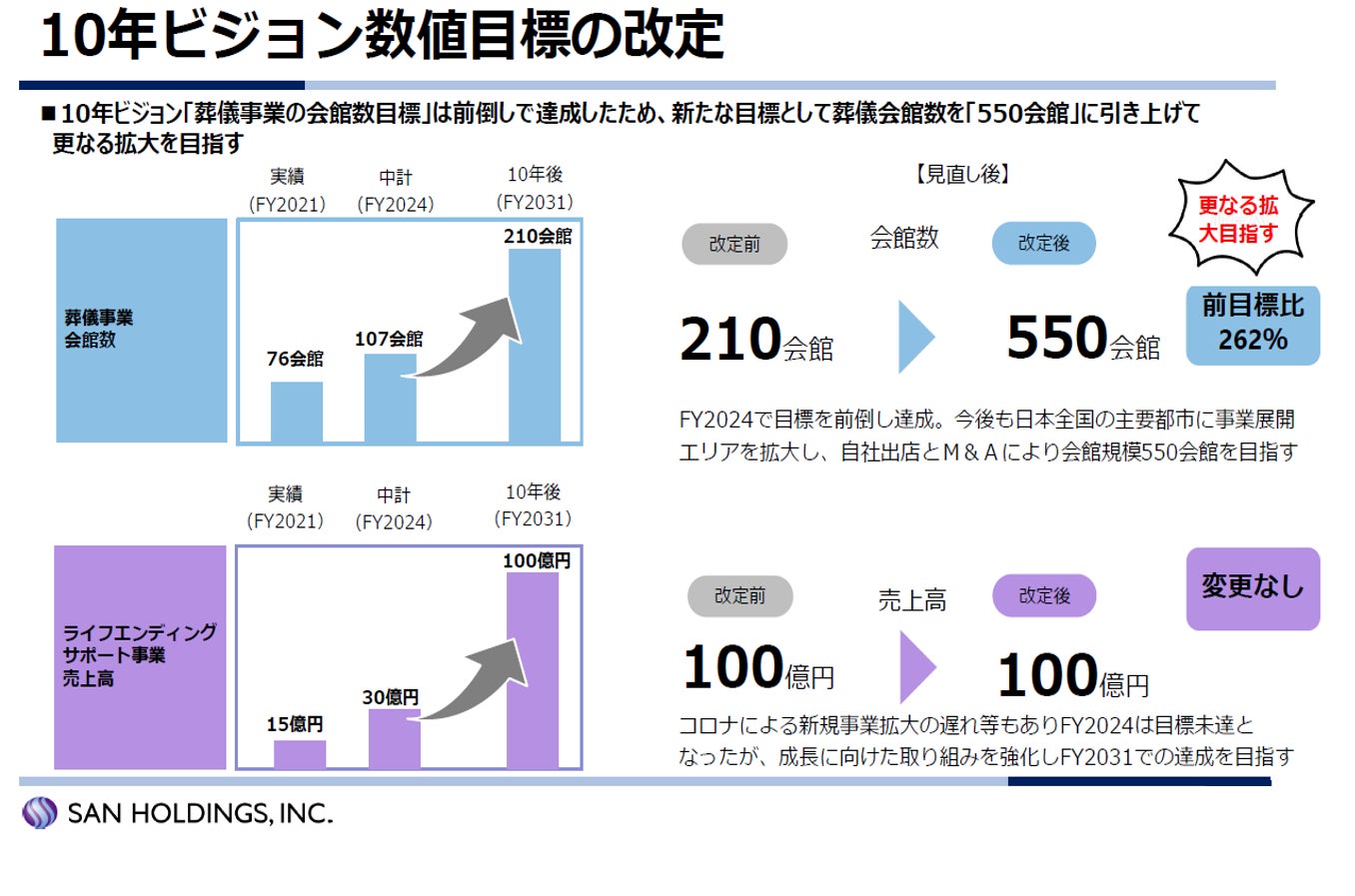 当社は創業100年を迎える2031年度に向けた長期ビジョンとして、「シニア世代とそのご家族の人生によりそい、ささえるライフエンディングパートナー」としての価値提供を掲げています。前中期経営計画の期間中には、当初2031年度目標としていた「210会館体制」を2024年度時点で前倒し達成し、この成果を踏まえて10年ビジョンの数値目標を「550会館」へと改定しました。中期経営計画(2025年度~2027年度)は、事業の拡大にとどまらず、サービス品質の向上、ガバナンス体制を維持しつつ「満足と感動」を提供できる企業への進化を図るものです。今後は、自社出店やM&Aを通じて全国主要都市への展開をさらに加速させるとともに、人生100年時代に寄り添うサービス提供を通じた社会貢献の実現を目指してまいります。