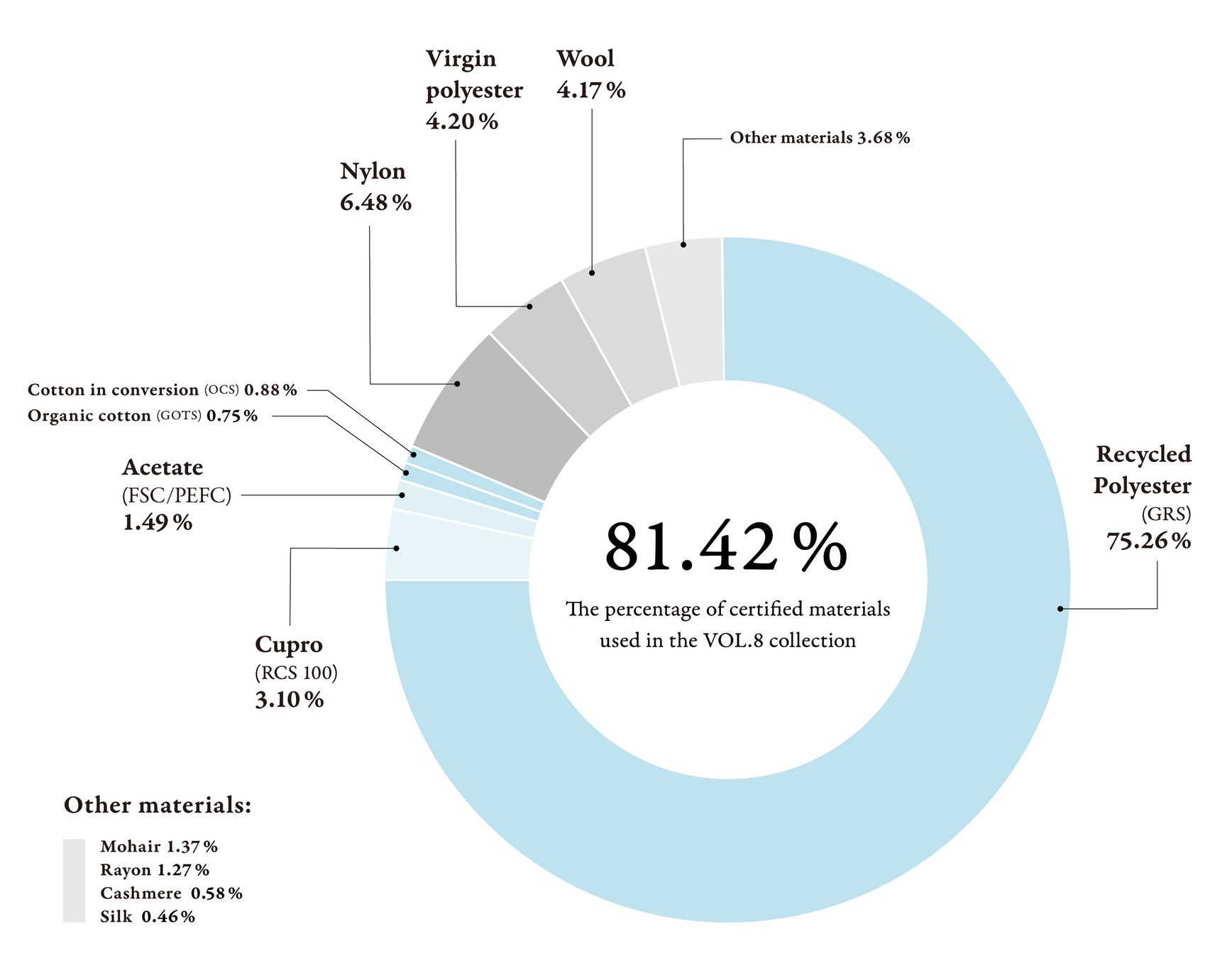 VOL.8コレクションの量産で使用した主要な素材のうち、地球環境や基本的人権への責任の履行が第三者機関より認証された素材の使用率は「81.42%」となりました。 (図1)