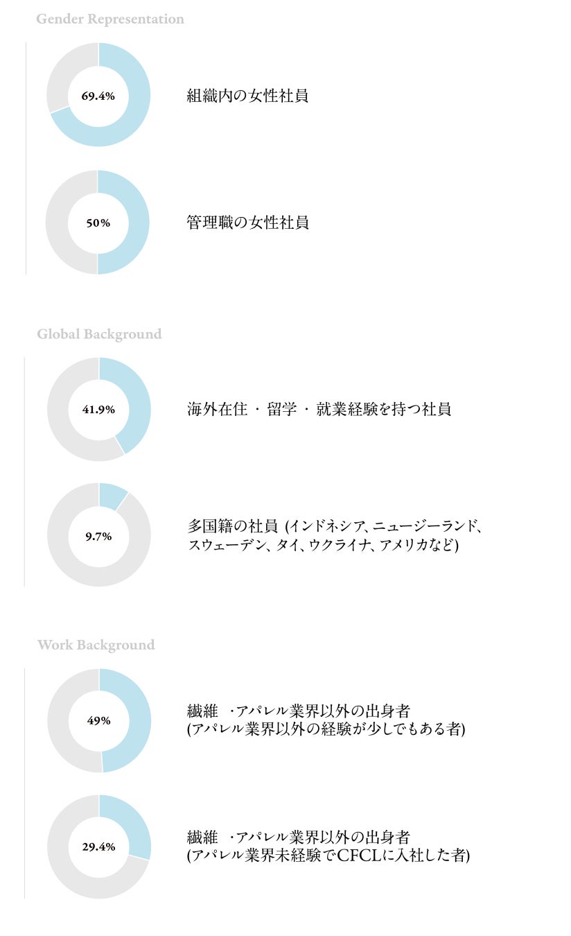 CFCLは海外への事業展開を積極的に行い、世界に通用するグローバル企業を目指しています。このことを実現するためには、社員のパフォーマンス維持やウェルネス向上の観点だけでなく、世界中の優秀な人材の獲得の観点においても、社内におけるJEDI (Justice=正義・Equity=公平性・Diversity=多様性・Inclusion=包括性) の推進が不可欠と考えています。CFCLは多様なバックグラウンドを持つスタッフの採用を進めており、現状では以下のような構成となっています。 (図3)