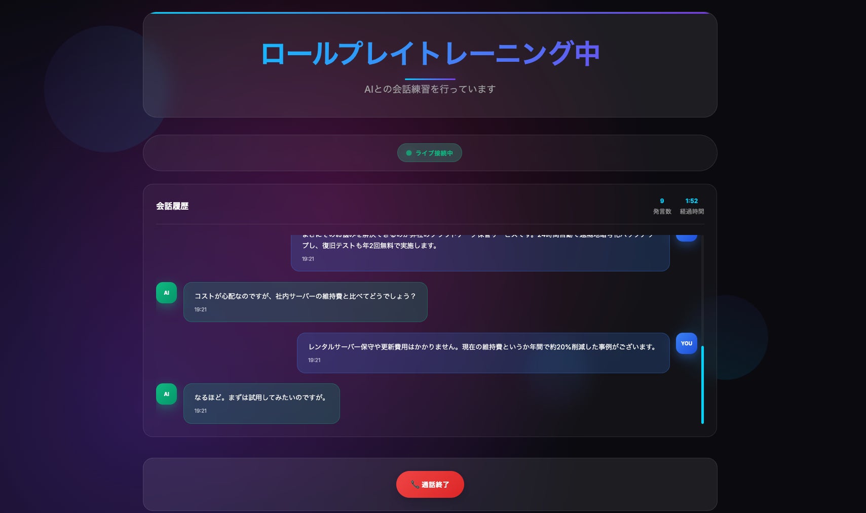AI相手による実際の音声対話でのロールプレイング研修ができる