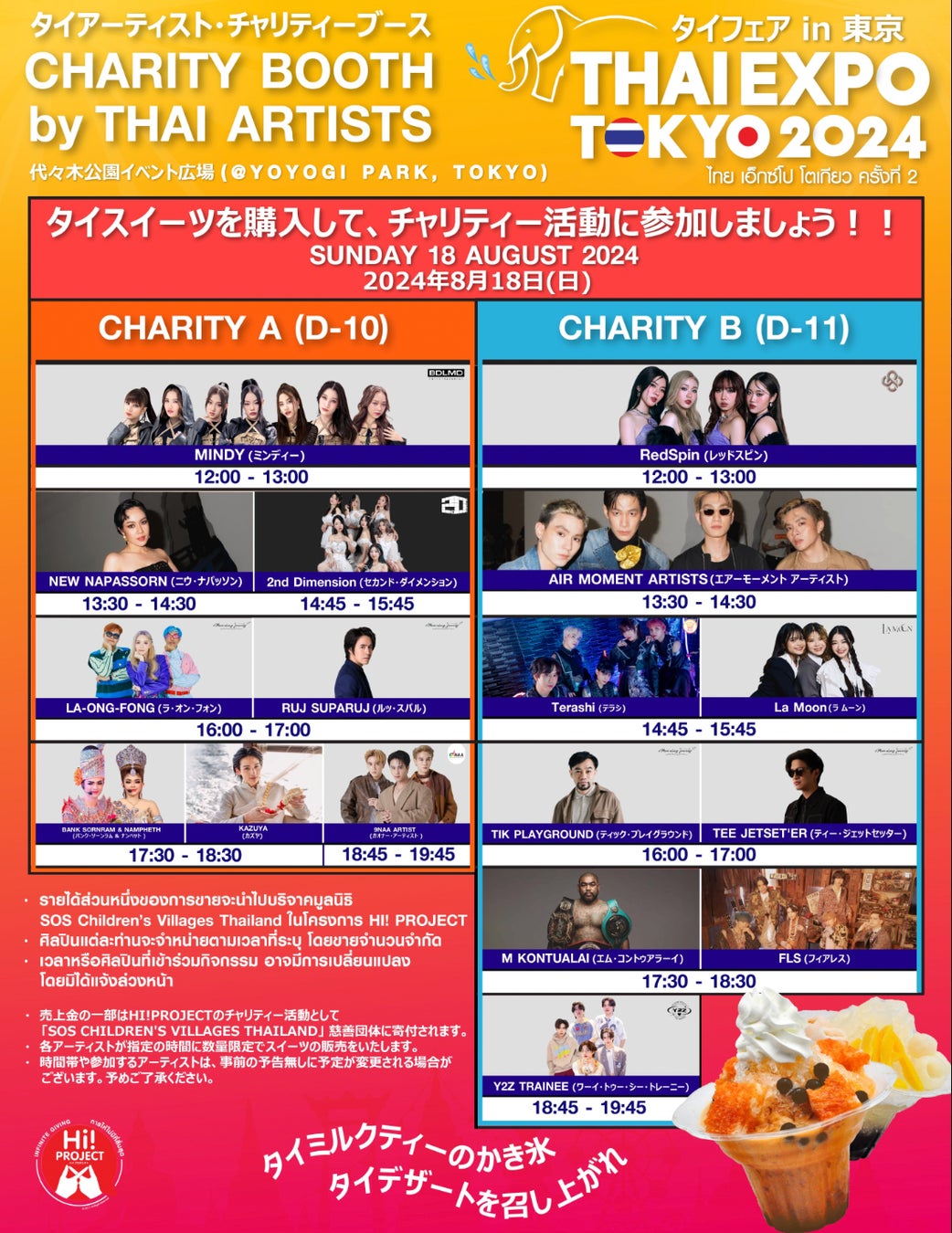 会場内のチャリティブースには豪華アーティストが勢揃い。アーティスト達から、タイスイーツ「タイミルクティーのかき氷」「パン・エン」を購入いただくと、収益金の一部はタイの“SOS Children's Villages Thai Foundation(https://www.sosjapan.org/sos-childrensvillages) 、また能登半島震災復興支援団体へと寄付されます。