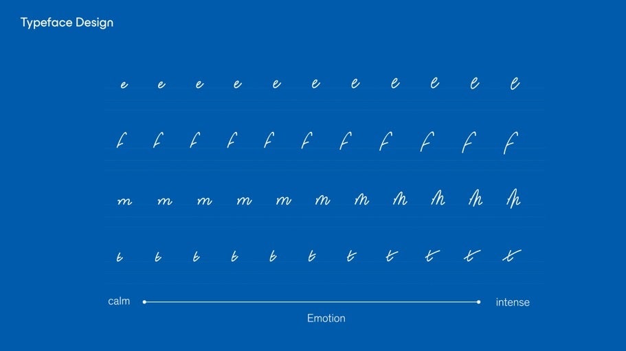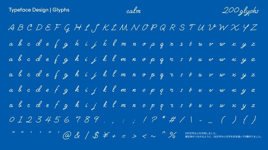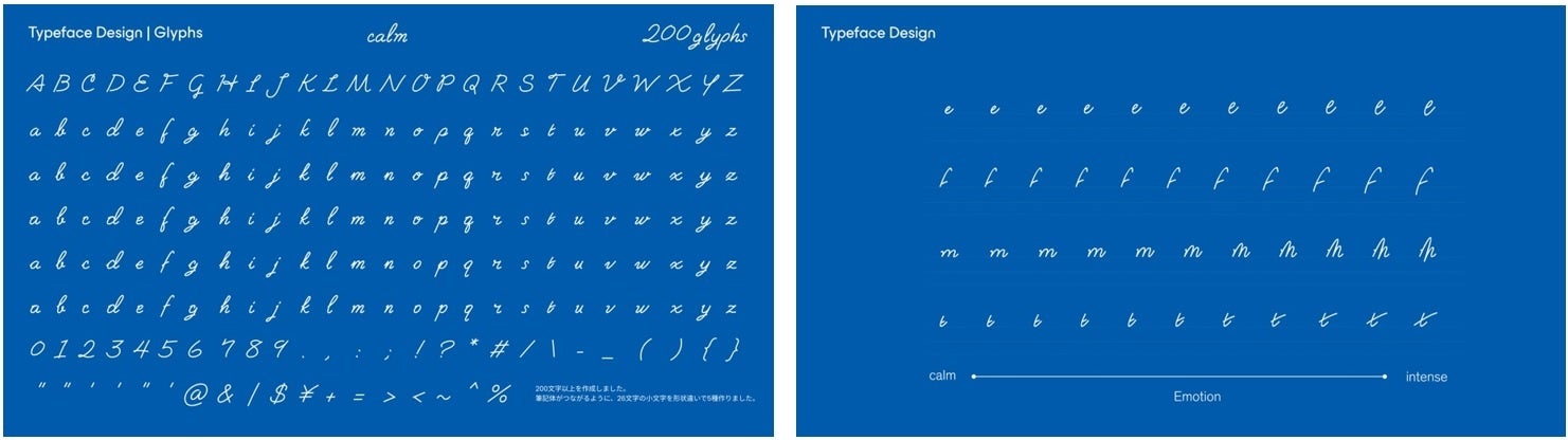 デジタルが中心の生活にシフトしている中で、あえてヒューマンタッチの筆記体を採用していると同時に、この独自のバリアブルフォントは、デジタル環境上で可変することで感情の起伏を豊かに表現することができます。