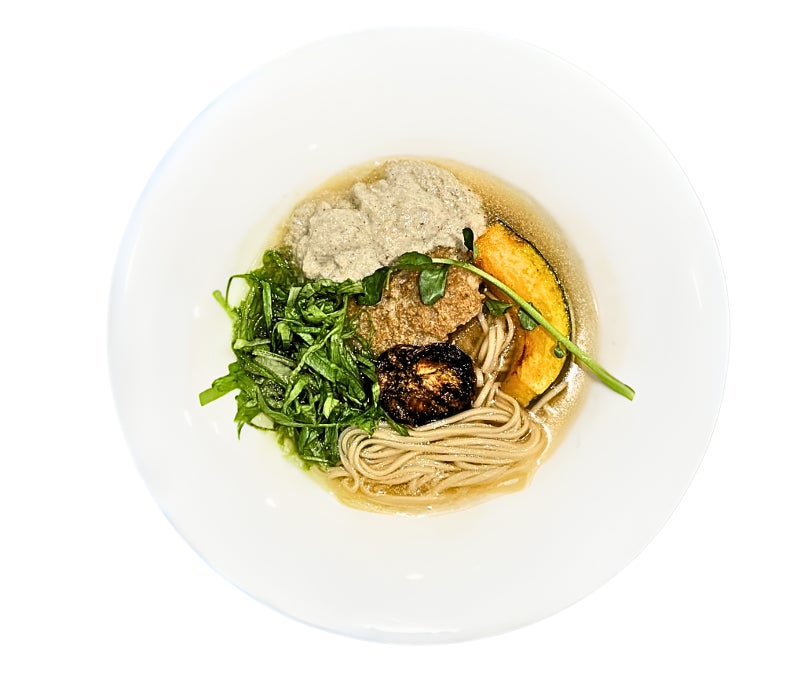 Nii店主の刈屋氏が禅麺を食べた際に沸いたイメージから食材を選定、特に季節感を意識した野菜を主に採用しています。今回は禅麺の通常のスープにオリジナルのごぼう&きのこの豆乳ソースをくわえ、具材に独自のプラントベースのつくね、焼き野菜をトッピング。これまで、ノドグロとフグやイカ墨などを使ったラーメンに挑戦し、ラーメン通を唸らせてきた同氏ならではの発想と手腕をプラントベースというルールの中であますことなく発揮、仕上げた逸品となっています。