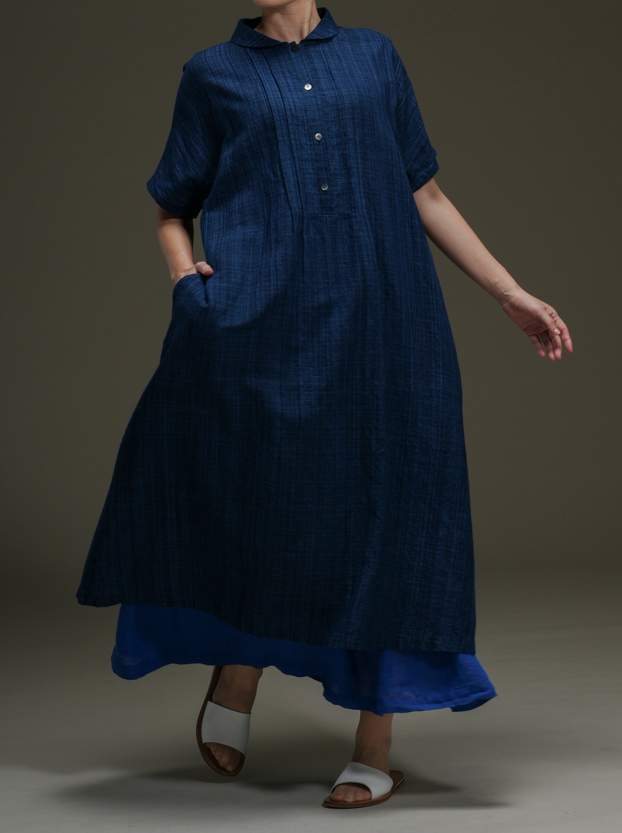 染めから織りまでを一貫して手がける、静岡県の「辻村染織」の藍染め生地を使用。生地になってから染めるのではなく、糸を束にした状態で染める「カセ染め」にこだわり、職人が毎日の気温や湿度に合わせて調整しながら、藍の色を追求しています。絣染めした綿糸と濃淡2色の麻糸を使用して織り上げた「雨絣(あまがすり)」が、繊細でみずみずしい表情を生み出します。