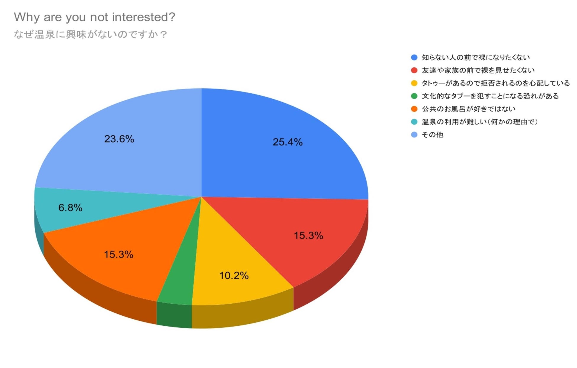 「裸」と「タトゥー」の問題に加え、「公共のお風呂が好きではない」が15.3%、「文化的なタブーを犯すことになる恐れがある」が3.4%という回答も注目すべきポイントです。