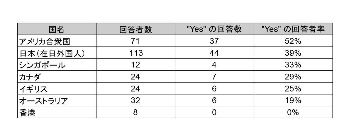さらに注目すべき点は、日本に住む外国人(Japan)の「Yes」の割合が39%で、全体の平均(38.2%)とほぼ同じか、わずかに高い程度に留まっている点です。