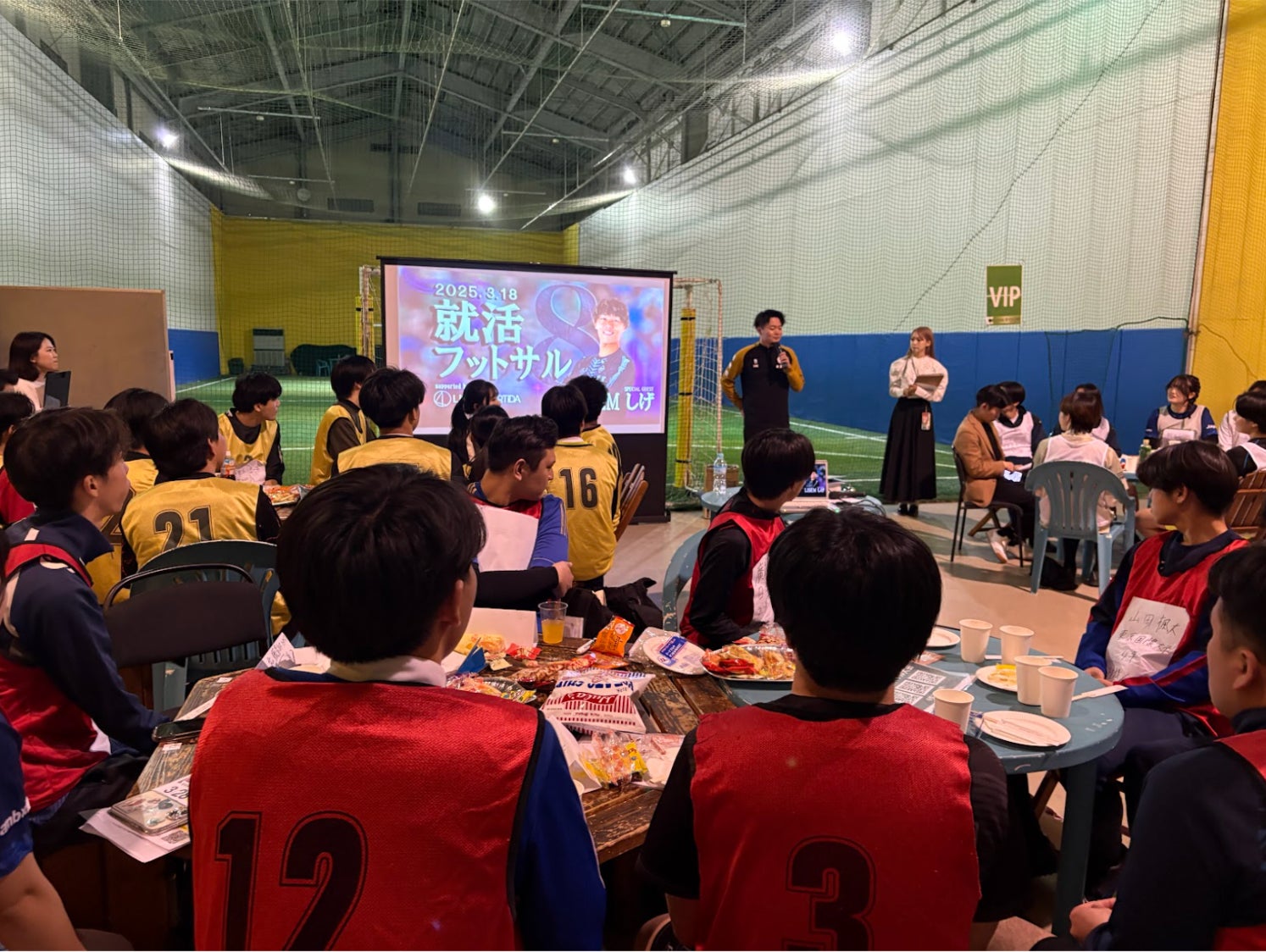 イベントは、企業プレゼンから始まり、各社の事業内容や魅力を直接知る貴重な機会となりました。その後のフットサル交流試合では、企業担当者と学生が同じチームとなり、優勝を目指して一致団結したプレーが多く見られました。試合は白熱し、ゴールのたびに歓声とハイタッチが交わされ、終始和やかな雰囲気で進行いたしました。