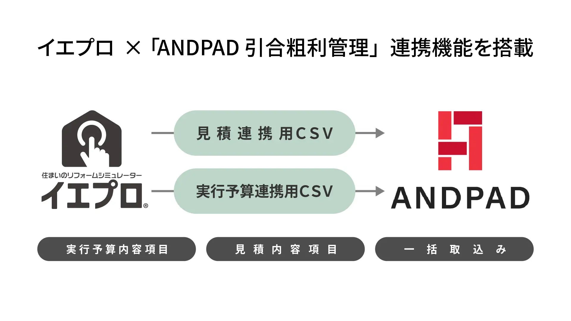 リフォーム業界では、見積りやプランニングに多大な時間と労力が費やされることが大きな課題となっています。イエプロは、この課題を解消するためのツールとして開発されました。今回、ANDPADの顧客管理から粗利・原価管理まで経営情報を管理できる「ANDPAD引合粗利管理」との連携によりさらなる業務効率化を実現し、リフォーム事業者の生産性向上に寄与します。