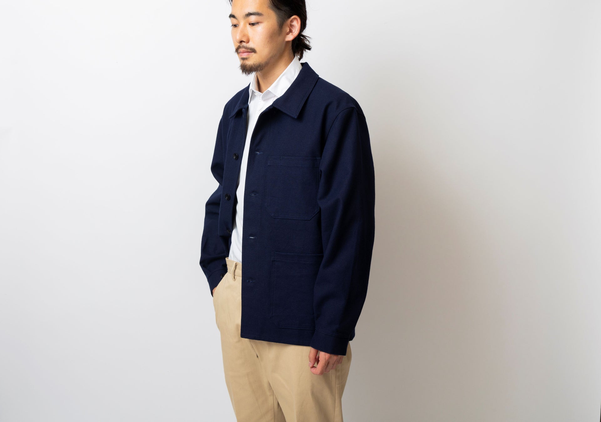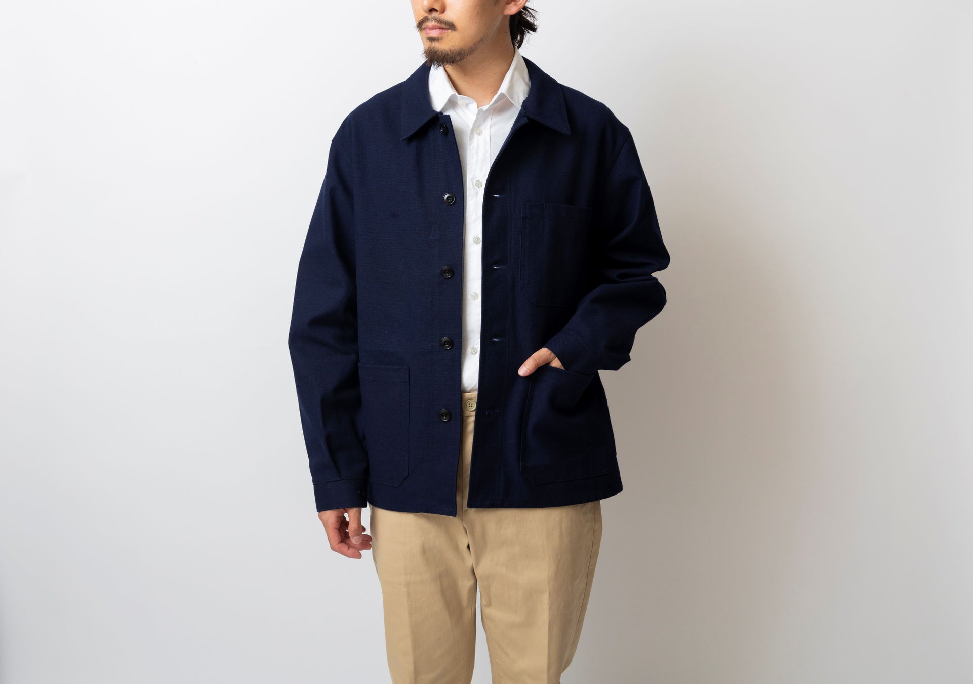 シャトル織機の特性を生かしつつ、新たな試みで開発をした生地で生産したMAEKAKE JACKETを販売します。デザインは長くフランスの職人に愛されてきたフレンチワークジャケットを踏襲して、糸の種類は前掛けと同じまま、ジャケットとして体にフィットする生地を新たに開発しました。出来上がった生地は丈夫ながら体なじみがよく、経年変化をお楽しみいただける味わい深いジャケットに仕上がっています。ぜひ現地でご試着ください。