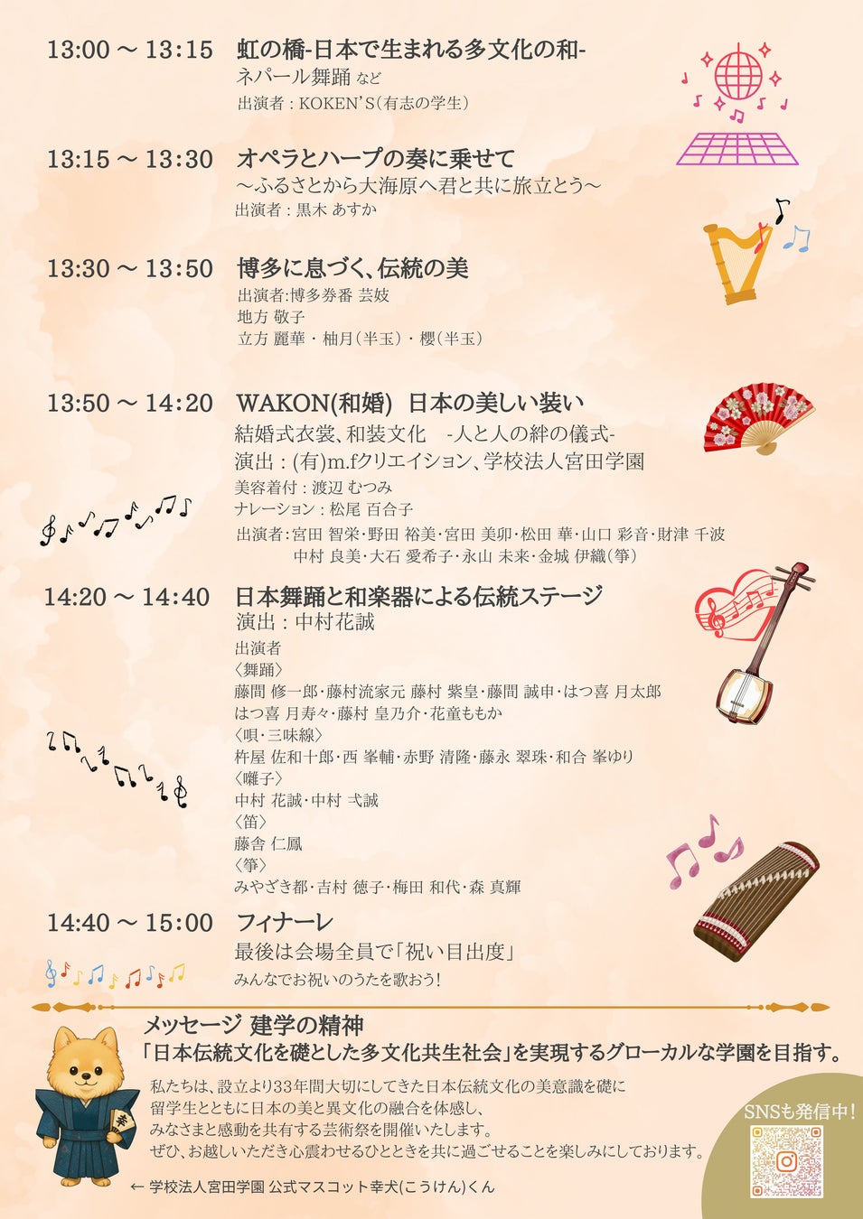 本イベントは、第 1 部「卒業式」、第 2 部「芸術祭」の 2 部構成で開催されます。第 1 部では、学び舎を巣立つ学生たちの新たな門出を祝う卒業式を執り行い、これまでの学びの成果と成長を振り返る節目の式典となります。続く第 2 部では、日本文化の魅力を体感する芸術祭を開催し、九州・福岡で活躍する文化の担い手の方々による多彩な演目を通して、日本文化の美しさや奥深さに触れる機会を創出します。学生たちが日本での学びを締めくくる姿に触れ、卒業の節目と文化を一体的に感じられる特別なプログラムとなっています。